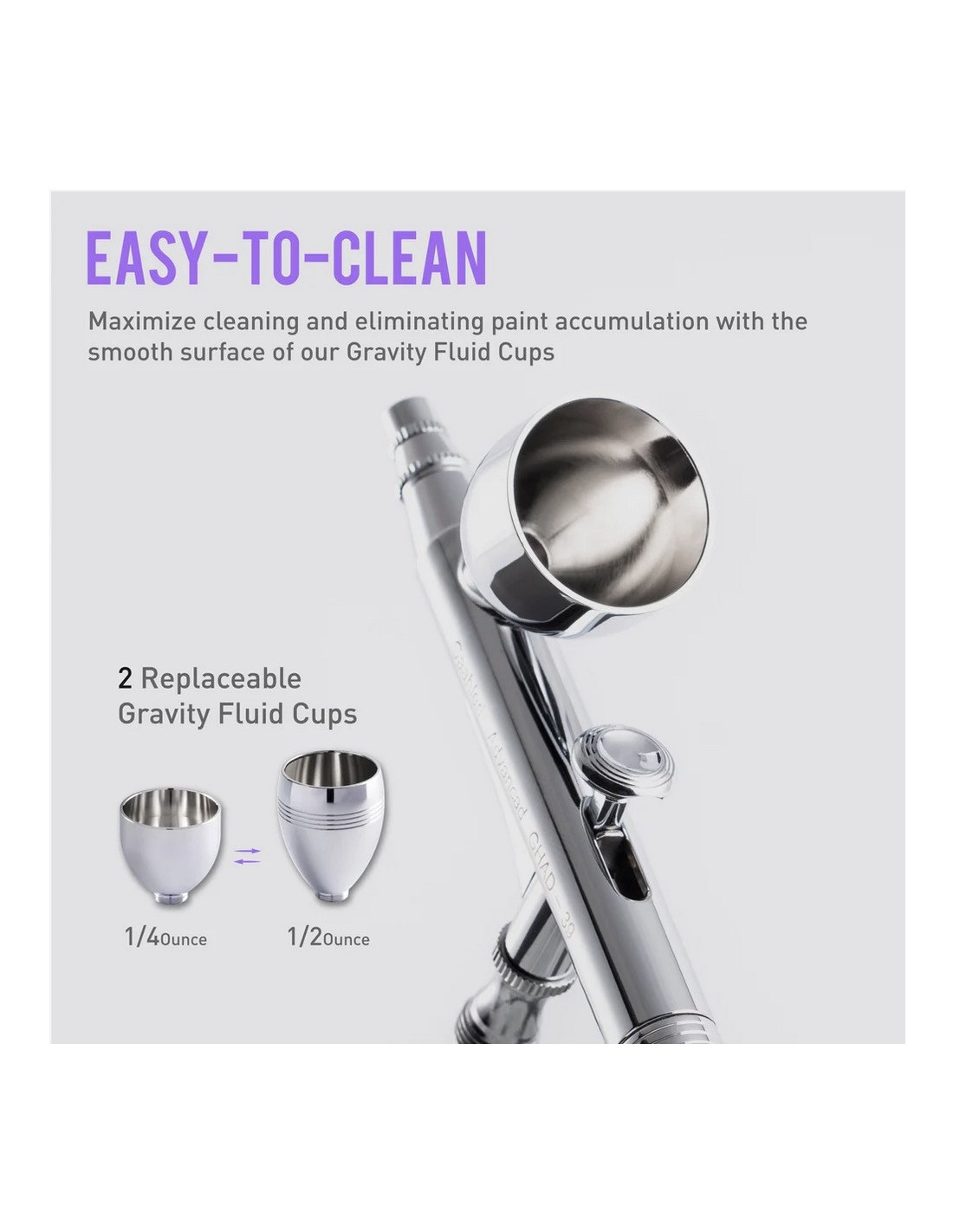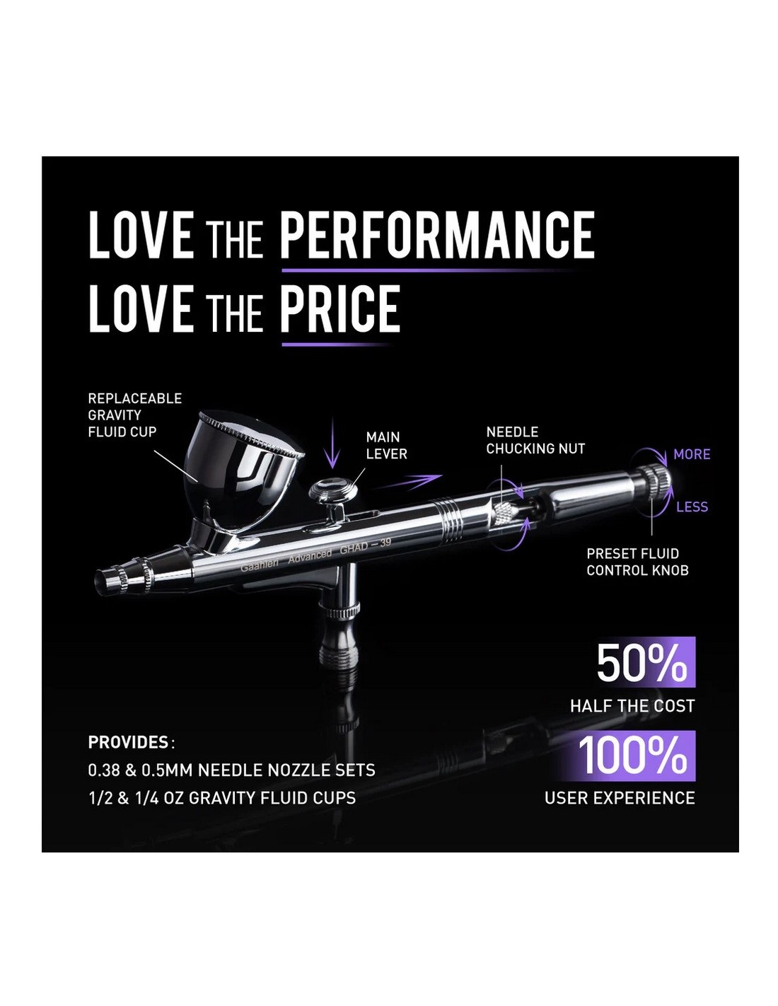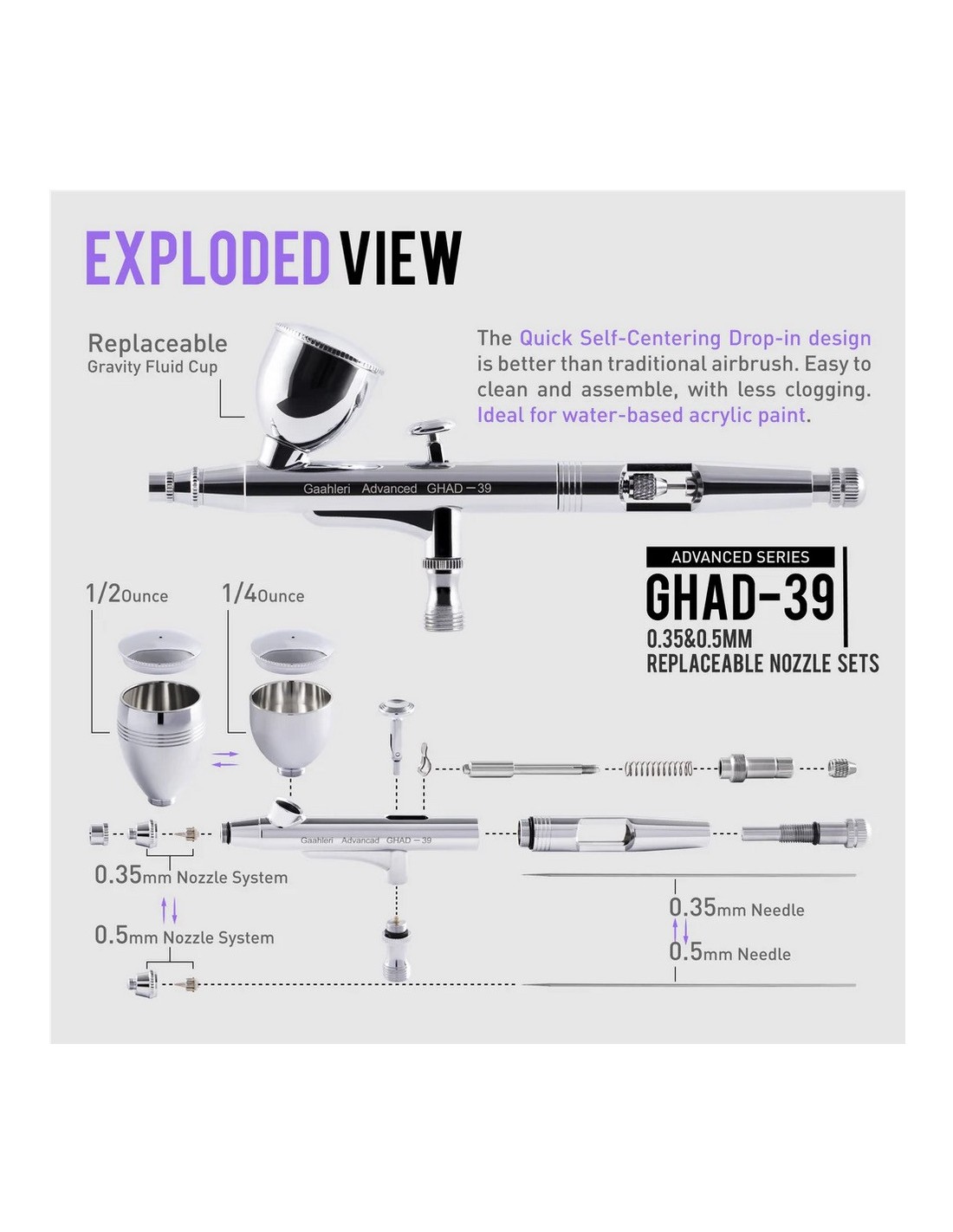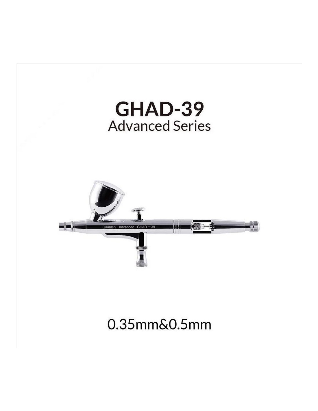 El GHAD-39 incluye opciones de boquilla de aguja de 0.35mm y 0.5mm con 8 Micro Canales de Aire para adaptarse a una amplia gama de usos. Ideal para trabajos de aerografía fina o ancha.