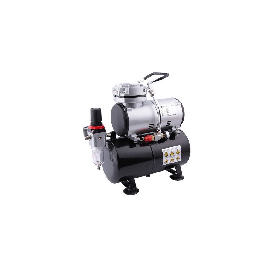 Compresor con Calderín y Manómetro D-80, Tipo pistón, sin aceite, parada automática, válvula de seguridad, regulador de presion y filtro de aire. Bajo ruido: 47 Db.