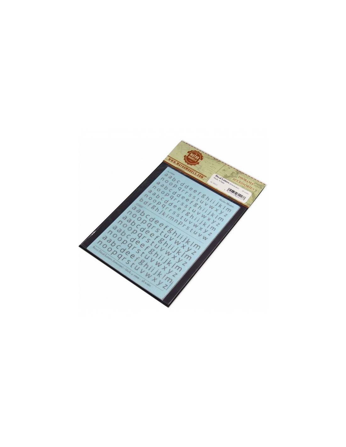 Contiene 1 hoja de tamaño A6 con varias calcomanía al agua. Esta hoja contiene pequeñas letras negras (minúsculas), disponibles en diferentes alturas. La altura se indica en la hoja, por lo que es fácil elegir la altura adecuada para sus necesidades.