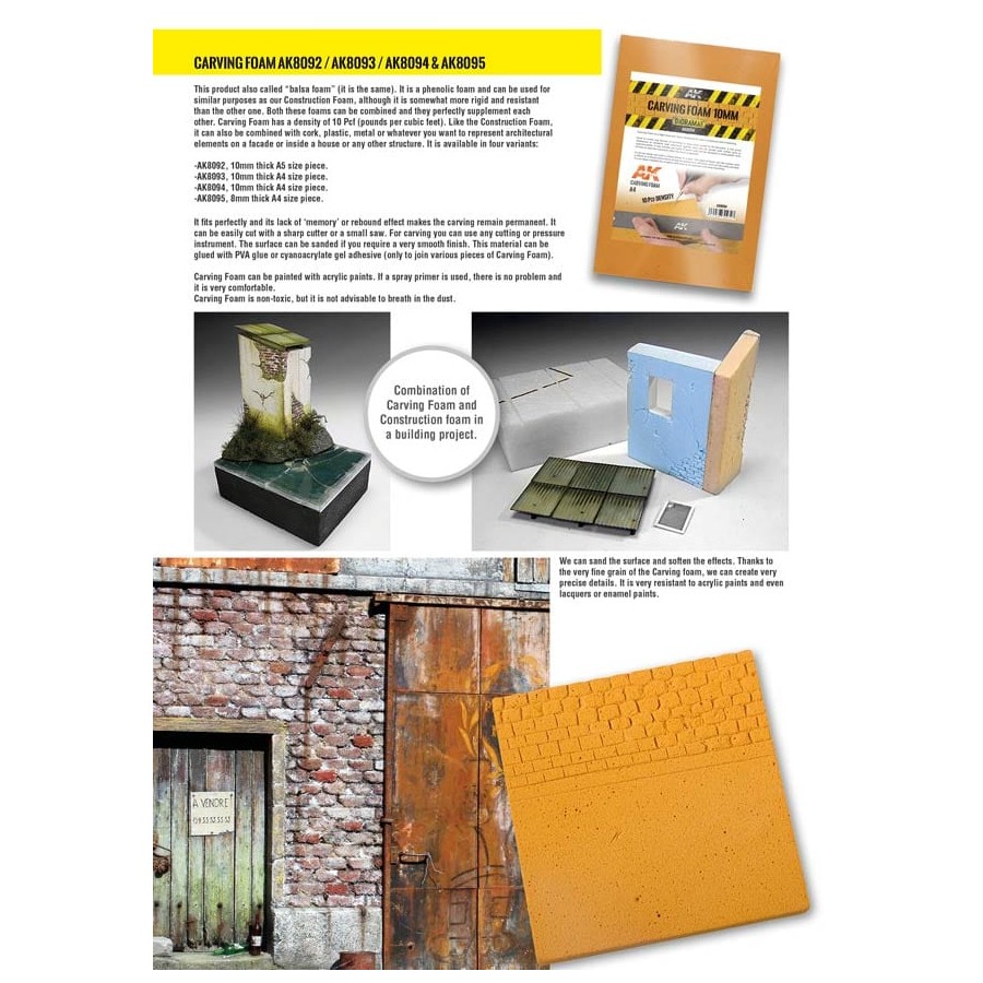 Nuestra gama de foams te ofrece materiales indispensables para construir distintas partes o edificios para tus dioramas y viñetas. Se presentan en diferentes tamaños y densidades que son muy útiles para el modelismo a distintas escalas y tienen unos precios muy competitivos. No hay necesidad de buscar materiales de construcción en lugares extraños: hemos seleccionado los mejores materiales para fines modelísticos para completar nuestra oferta y cubrir prácticamente todas las necesidades de los modelista para realizar y tallar edificios o hacer terrenos basados en Foam