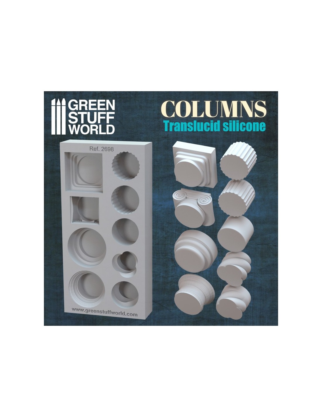 Molde de columnas fabricado en silicona semitransparente de grado alimentario de alta calidad, que permite crear tanto columnas completas como fragmentos de columnas. Incluye diferentes piezas de pilares en diferentes estilos arquitectónicos: dórico, jónico y salomónico o incluso combinaciones de todos ellos. Válido tanto para creaciones realistas de modelismo o hobby, cómo de arquitectura. Escala aproximada 1:48 (wargames) a 1:35.
