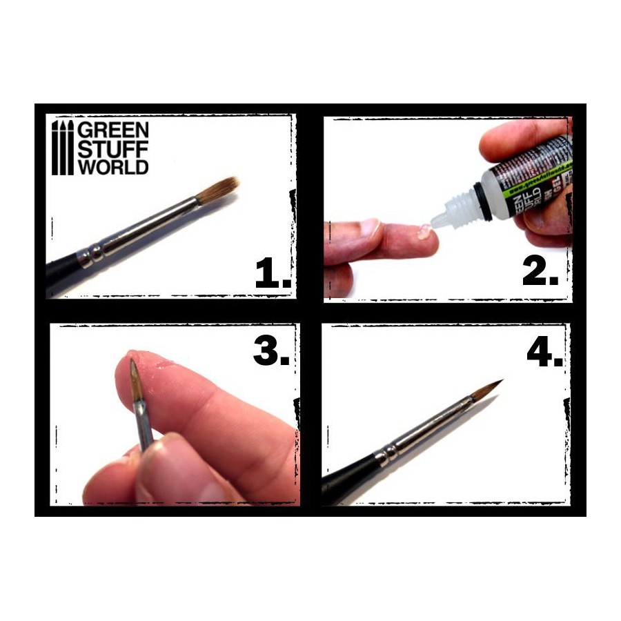 Moja la punta del pincel en el gel, dándole forma con los dedos y lo dejándolo secar unos 10 minutos. Antes de volver a pintar, moja un poco la punta del pincel en agua para ablandarla. Repite el proceso después de cada sesión de pintura para que siempre estén como nuevos.