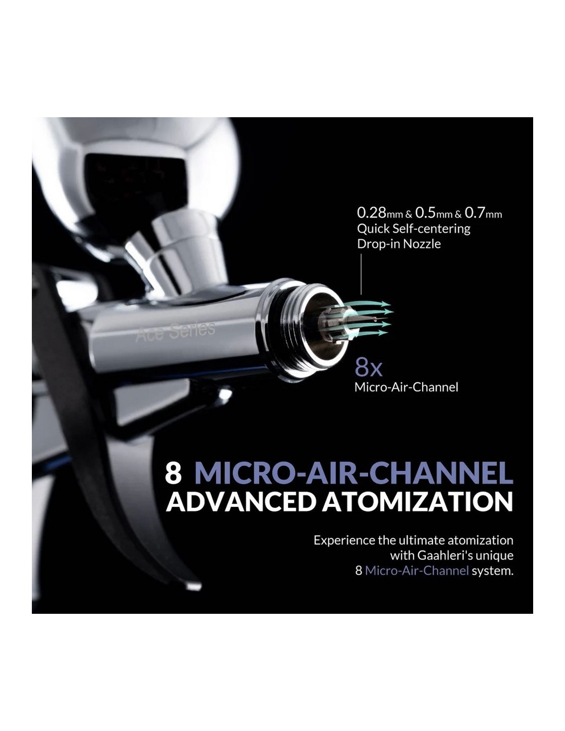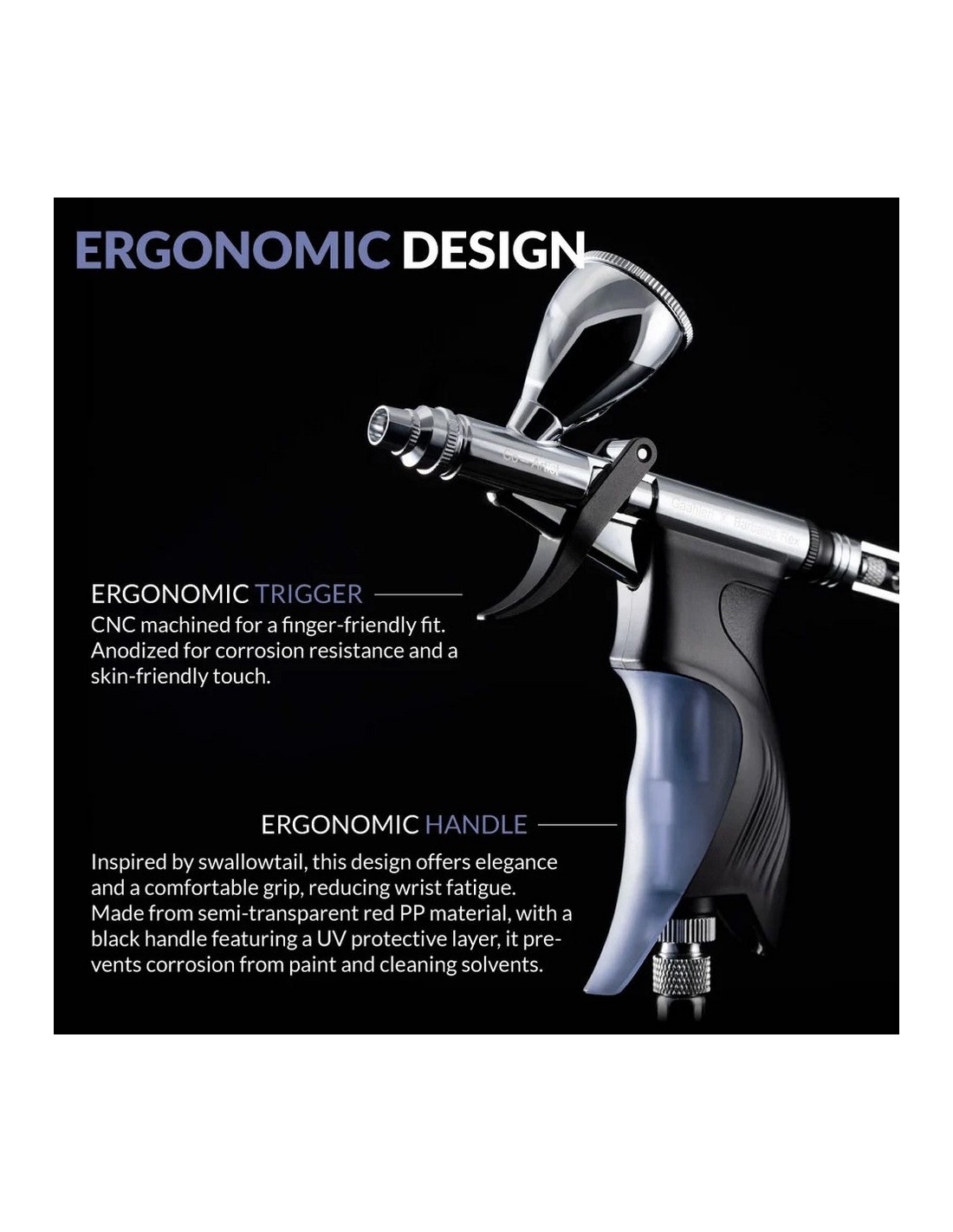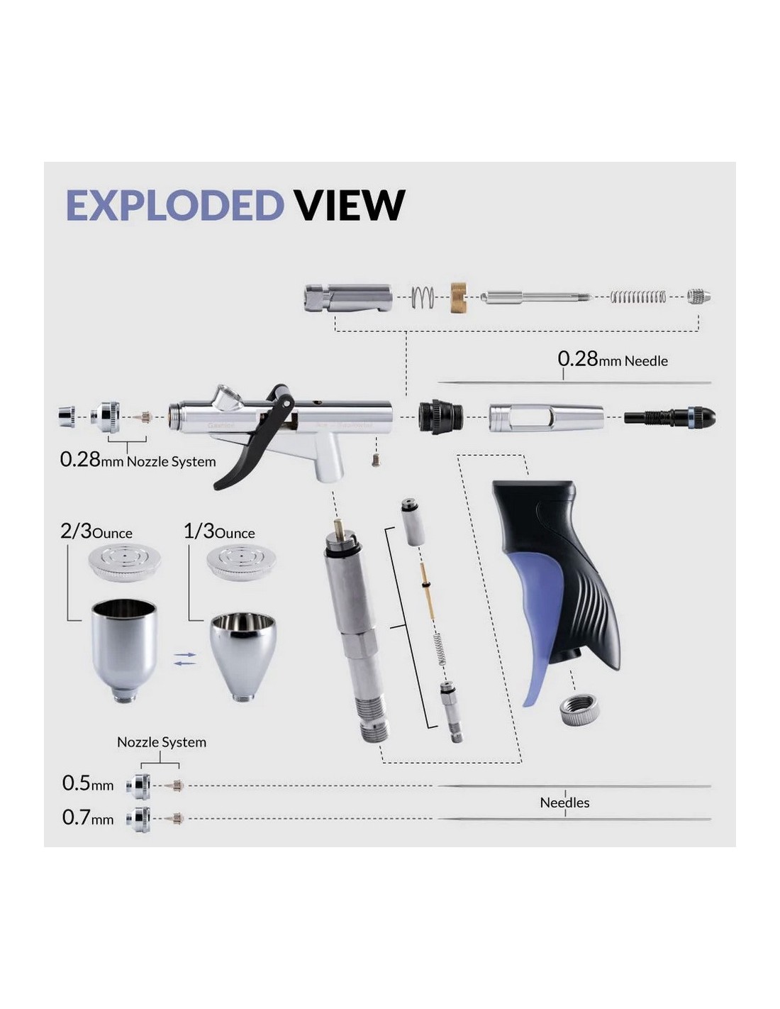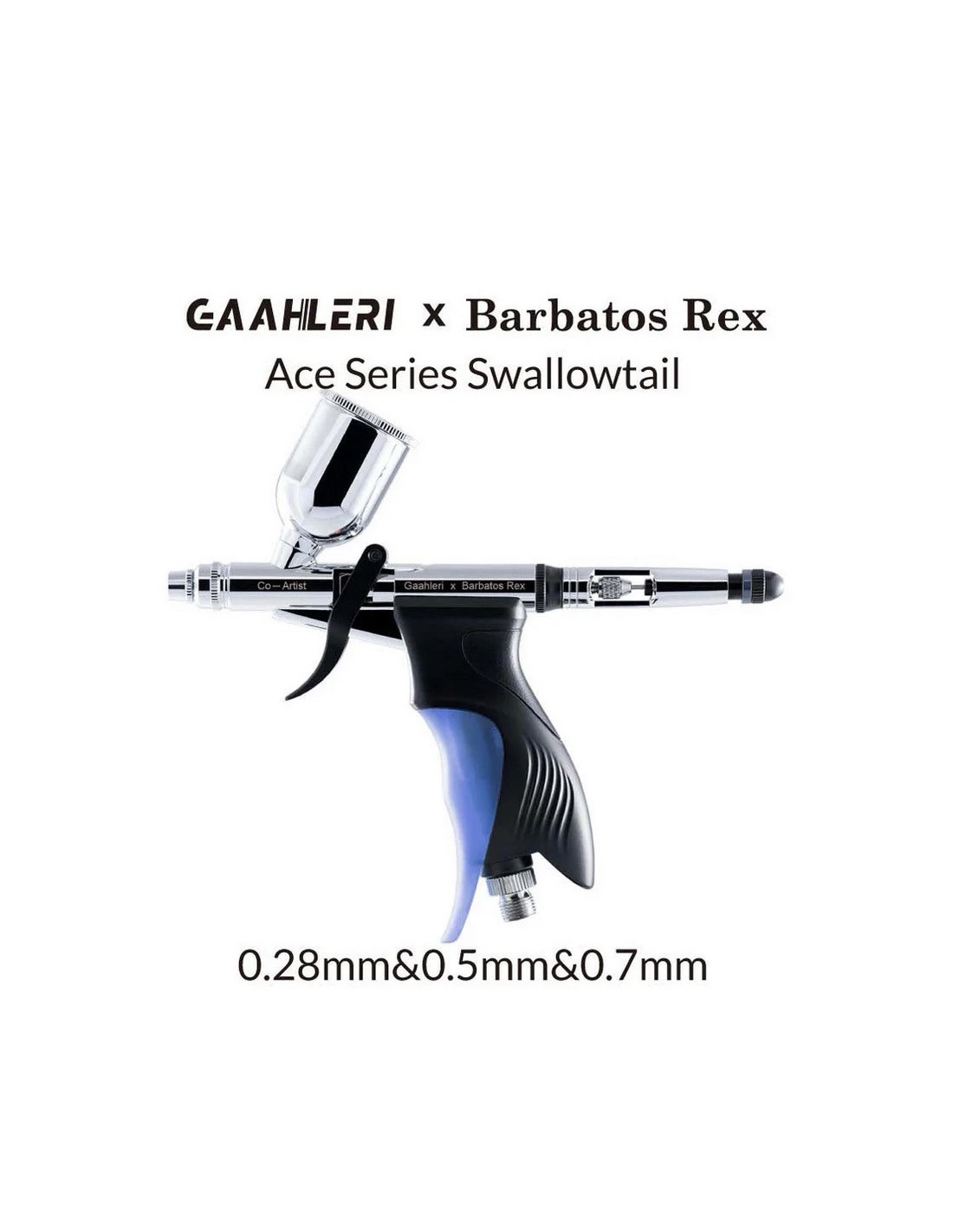 The Barbatos Rex Swallowtail airbrush includes 3 different needle sizes. 0.28mm is best for fine/precision work, while 0.5mm and 0.7mm is included for wide surface airbrushing.
