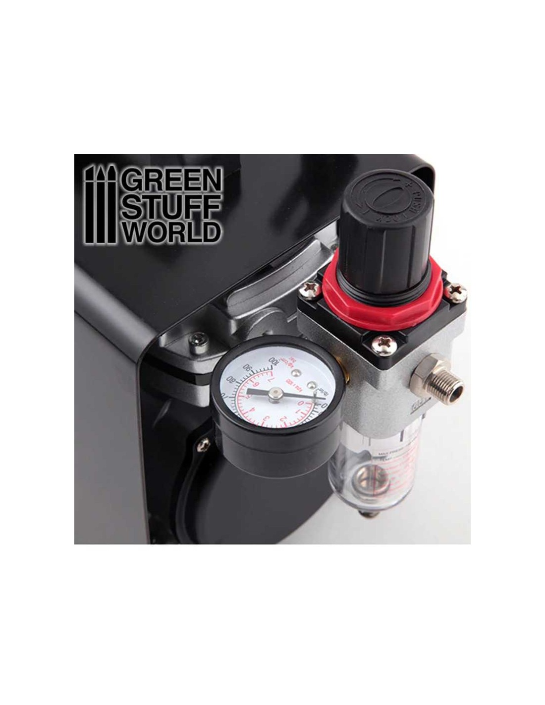 GSW's Airbrush Compressor, with 23l/m air flow, without tank (pressure vessel) and designed for minimal noise, with an external iron cover. The pressure gauge shows the max pressure and working pressure and also filters the water in air, widely used for hobby or model painting air supply. Low weight also makes it easily portable.