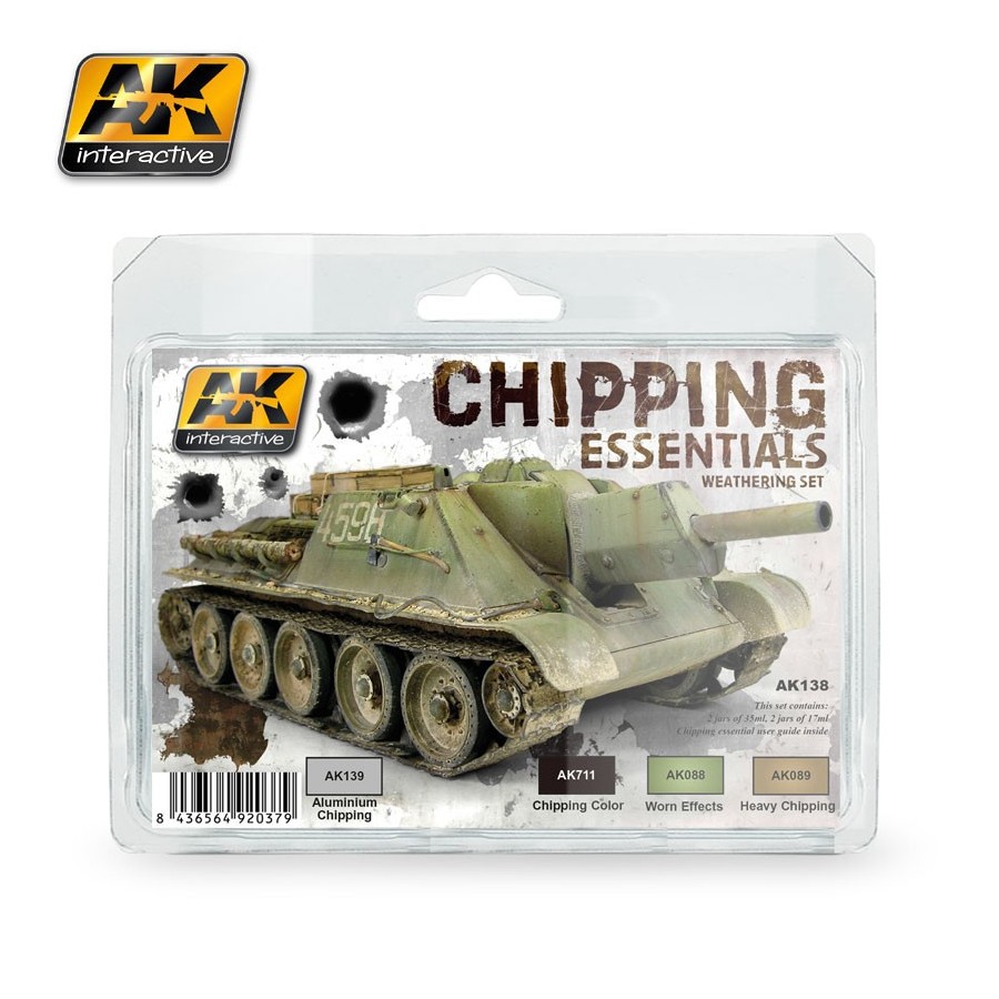 AK is proud to present the first weathering set dedicated to the art of chipping. Inside we have included some of our best selling weathering products such as: Worn Effects, Heavy Chipping, and our classic Chipping Color. Virtually any type of paint chip can be easily created. This is a truly universal set valuable to not only AFV modelers, but aircraft modelers, Scifi vehicles, trains and so much more. We have added a new product to this set, inside you will find Aluminium Chipping; a color perfect for replicating chips in paint that has been applied to aluminium surfaces. Don’t make the common mistake that a lot of modelers make, that being the use of the same color for chipping effects. A paint chip on an airplane wing should not look the same as a paint chip from a tank, or any other AFV.