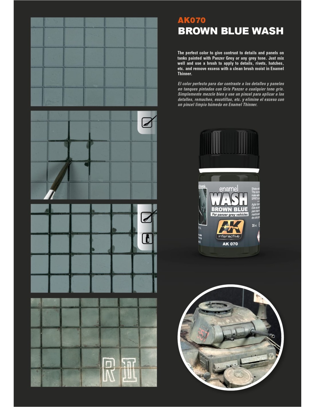 Un color perfecto para contrastar todos los detalles y paneles de tus tanques en color Gris Panzer. Tan sólo agítalo bien y aplícalo con un pincel sobre los detalles, remaches, escotillas, etc.