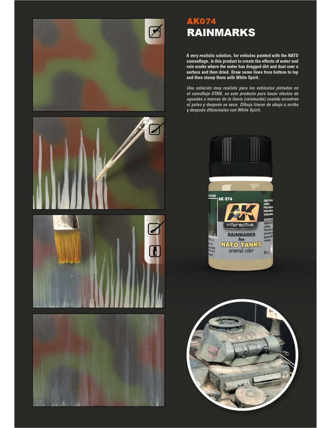Efectos de suciedad escurrida específicamente diseñado para vehículos pintados en camuflajes tricolores utilizados principalmente por la OTAN (NATO). Agítalo muy bien y después dibuja líneas verticales irregulares en los laterales de tu vehiculo y después difumínalas con un pincel ancho y plano usando un poco de nuestro White Spirit.