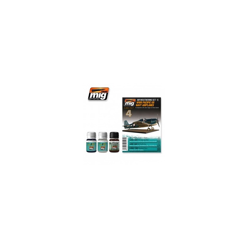 Set de envejecido de aviones del US Navy en el Pacifico durante la Segunda Guerra Mundial. Incluye dos colores de la línea Panel Line Wash que nos permitirán perfilar fácilmente los colores de estos aviones: A.MIG-1603PLW DARK SEA BLUE, para el color azul oscuro de las zonas superiores A.MIG-1604 PLW PACIFIC DUST, para el azul claro de las zonas inferiores y polvo típico producido en las pistas de las islas del pacifico. También incluye el efecto de escurrido A.MIG-1203 STREAKING GRIME que nos ayudará a realizar los efectos de suciedad típicos de los aviones embarcados en el pacifico en la marina americana.