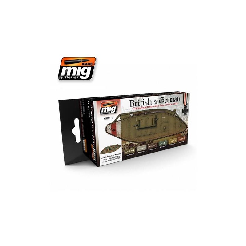 Set de pinturas acrílicas de base agua para pintar vehículos Británicos y Alemanes de la Primera Guerra Mundial. Incluye los colores: -A.MIG 077 Dull Green, A.MIG 078 Ochre Earth and A.MIG-079 Clay Brown for German vehicles - A.MIG 074 Green Moss for most of the UK vehicles during WW I -A.MIG-075 Stone Grey, A.MIG-076 Brown Soil and A.MIG 078 Ochre Earth for Solomon paint scheme of UK vehicles deployed in Europe. Los colores incluyen el Efecto de Reducción de Escala que nos permitirá conseguir el color adecuado en nuestras maquetas. Todas las pinturas tienen una formula optimizada para obtener el máximo rendimiento tanto con pincel como con aerógrafo. Cada bote incluye un agitador de acero inoxidable para facilitar una mezcla más rápida y homogénea. Presentación en botes de 17ml. Soluble en agua, sin olor y no tóxico. Agite bien antes de cada uso. Recomendamos A.MIG-2000 Acrylic Thinner para una correcta disolución. Secado completo en 24h.