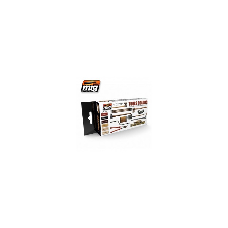 Set acrílico para el pintado de las herramientas de cualquier vehículo o diorama. También es útil para pintar madera. Incluye 3 tonos de madera, uno metálico y el color de la bakelita usado como mango en algunas herramientas, como por ejemplo las cizallas alemanas de la Segunda Guerra Mundial. También incluye otro color marrón oscuro útil para hacer el oxido de las partes metálicas y para hacer las vetas y sombras en la madera. Estas pinturas acrílicas presentan una formula optimizada para obtener el máximo rendimiento tanto con pincel como con aerógrafo. Presentación en botes de 17ml. Soluble en agua, sin olor y no tóxico. Agite bien antes de cada uso. Recomendamos A.MIG-2000 Acrylic Thinner para una correcta disolución. Secado completo en 24h. Incluye los colores: A.MIG-036 OLD WOOD A.MIG-037 NEW WOOD A.MIG-038 LIGHT WOOD A.MIG-043 SHADOW RUST A.MIG-045 GUN METAL A.MIG-913 RED BROWN BASE