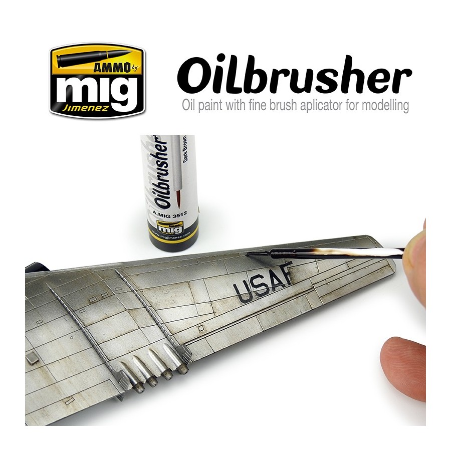 This 21 OILBRUSHER COLLECTION includes the most common shades used in scale models, avoiding unnecessary tones that would remain otherwise mostly unused on the bench. Panting with oils has never been so fun and simple. OILBRUSHER is your oil paint with built-in applicator brush; a unique and exclusive AMMO product.