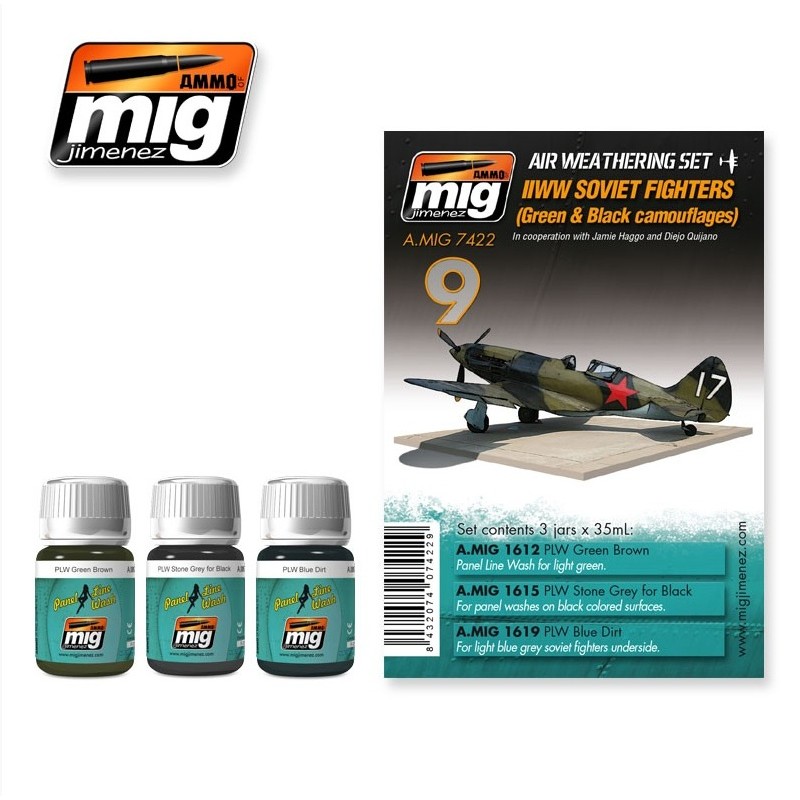 Set de lavados para líneas de panel de cazas Soviéticos durante la Segunda Guerra Mundial. Cada bote incluye un agitador de acero inoxidable para facilitar una mezcla más rápida y homogénea. Incluye 3 colores de la línea Panel Line Wash que nos permitirán perfilar fácilmente dichos aviones: A.MIG-1612 PLW Green Brown, perfecto para el camuflaje verde. A.MIG-1615 PLW Stone Grey for Black, para el camuflaje negro. A.MIG-1619 PLW Blue Dirt, para las zonas gris-azuladas de las superficies inferiores.