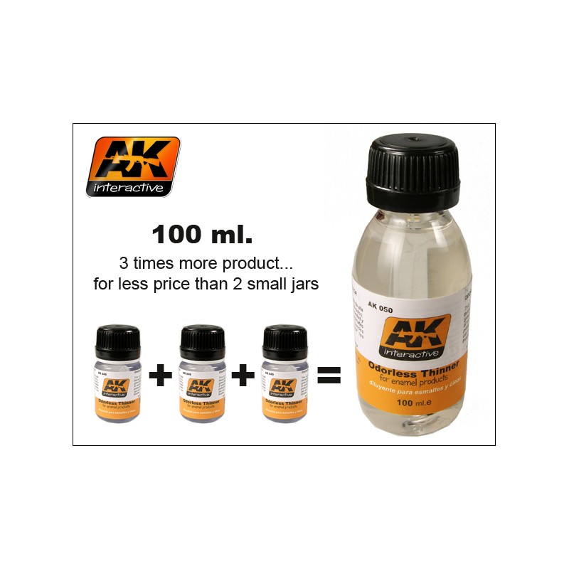 Nuestro diluyente sin olor es muy diferente a nuestro White Spirit. Este producto, además de ser inodoro, es más suave que el White Spirit, por lo que es muy útil para hacer difuminados muy suaves y delicados en nuestras maquetas, trabajar con lavados y con filtros. Este nuevo envase con una capacidad de 100ml, tiene prácticamente la misma cantidad de tres botes...
