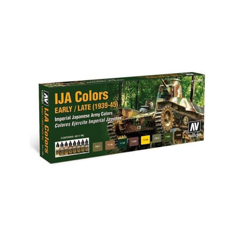 Este set contiene los colores básicos de camuflaje empleado por el Ejército Imperial Japonés (IJA) en los años 1939-1945. El set incluye tres colores nuevos. A boxed set which contains the basic camouflage colors used by the Imperial Japanese Army (IJA) in the years 1939-1945. Three new colors are presented in this set. Contenido: - 6 Botellas de Model Air de 17ml. - 2 Botellas de Surface Primer de 17 ml. Contents: - 6 Bottles Model Air in 17ml. - 2 Bottles Surface Primer in 17 ml.