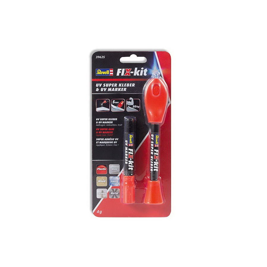 Apply. Light up. Firmly! The Revell FIX-kit UV Super Glue is so easy to use. Due to the special properties of the product, the parts can be easily placed before gluing. The adhesive effect only starts when the bonding area is illuminated with the enclosed UV lamp. After approx. 5 seconds, the parts are firmly bonded together. Revell FIX-kit UV Superkleber bonds various materials such as plastic, glass, ceramics or wood and is therefore extremely versatile.