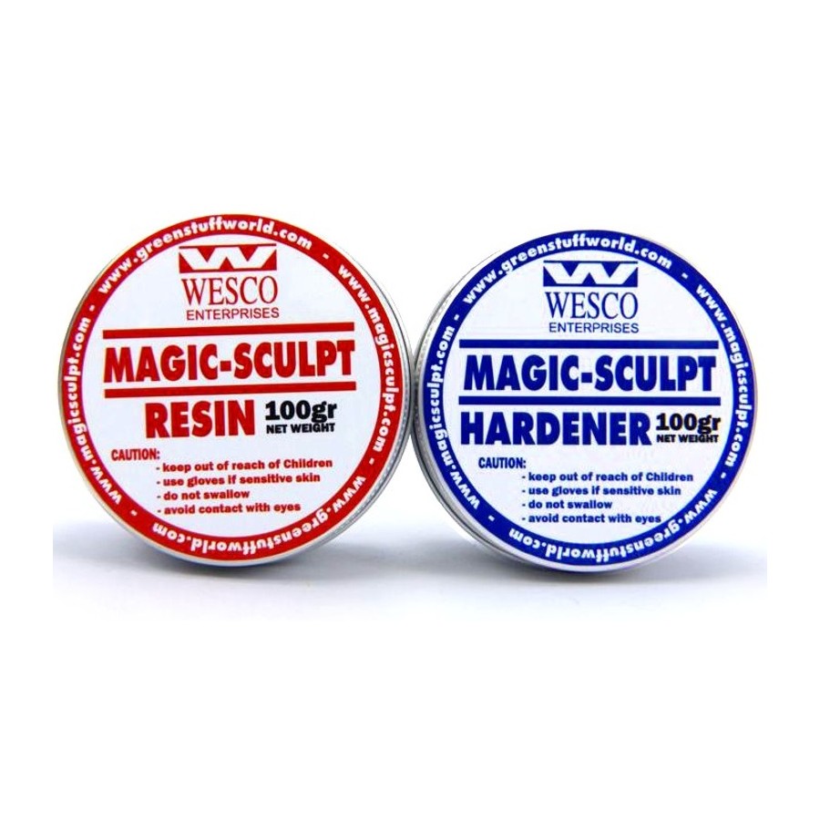 Magic Sculpt is a room-temperature curing two-part epoxy putty that lets you create extra-fine, highly-detailed sculpture projects. Magic Sculpt is also an excellent repair putty with tremendous strength and adhesive properties. Mixed components (add pigment if desired) have a clay consistency with about 1-2 hours of working time.