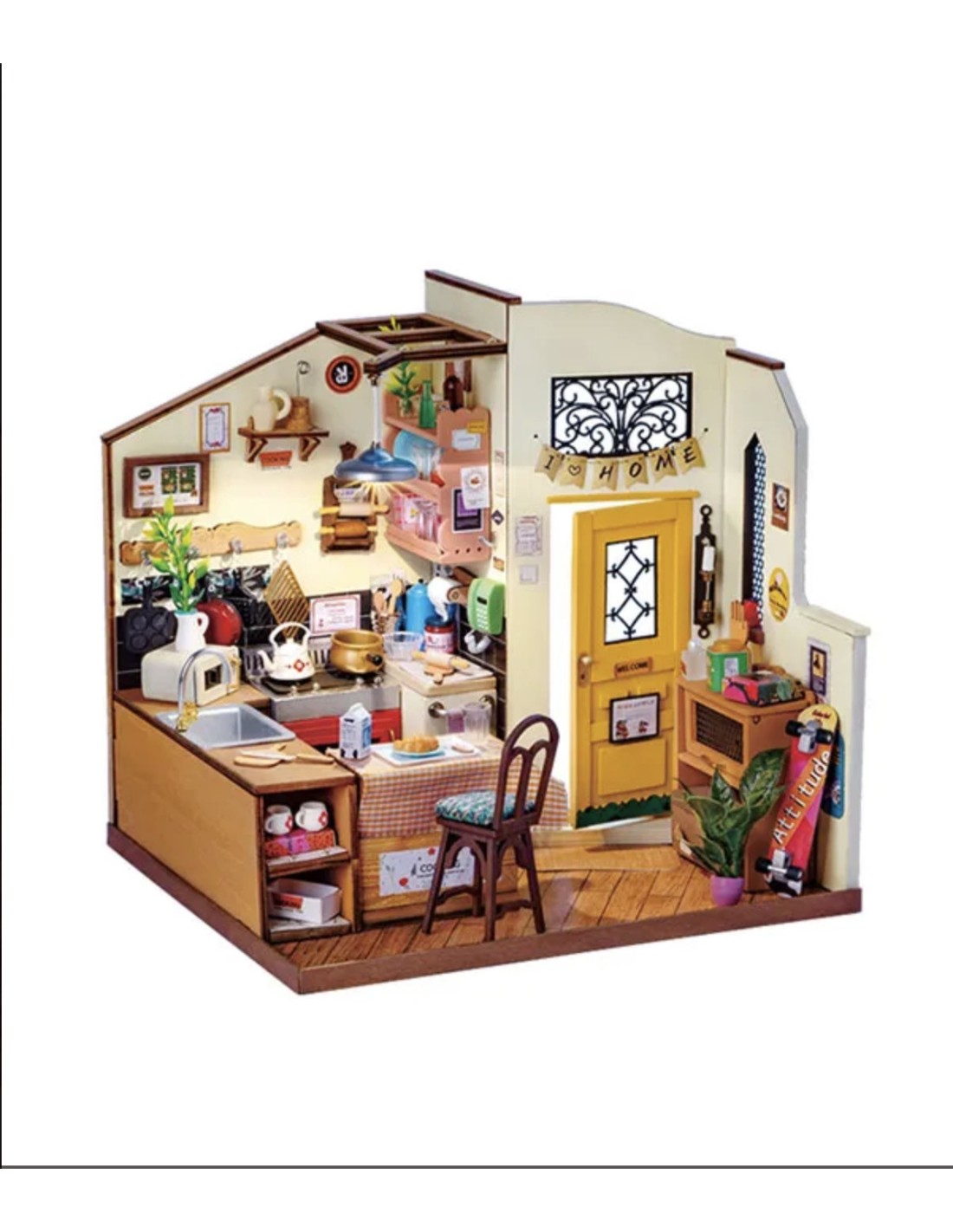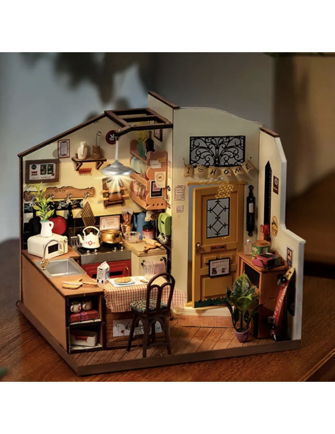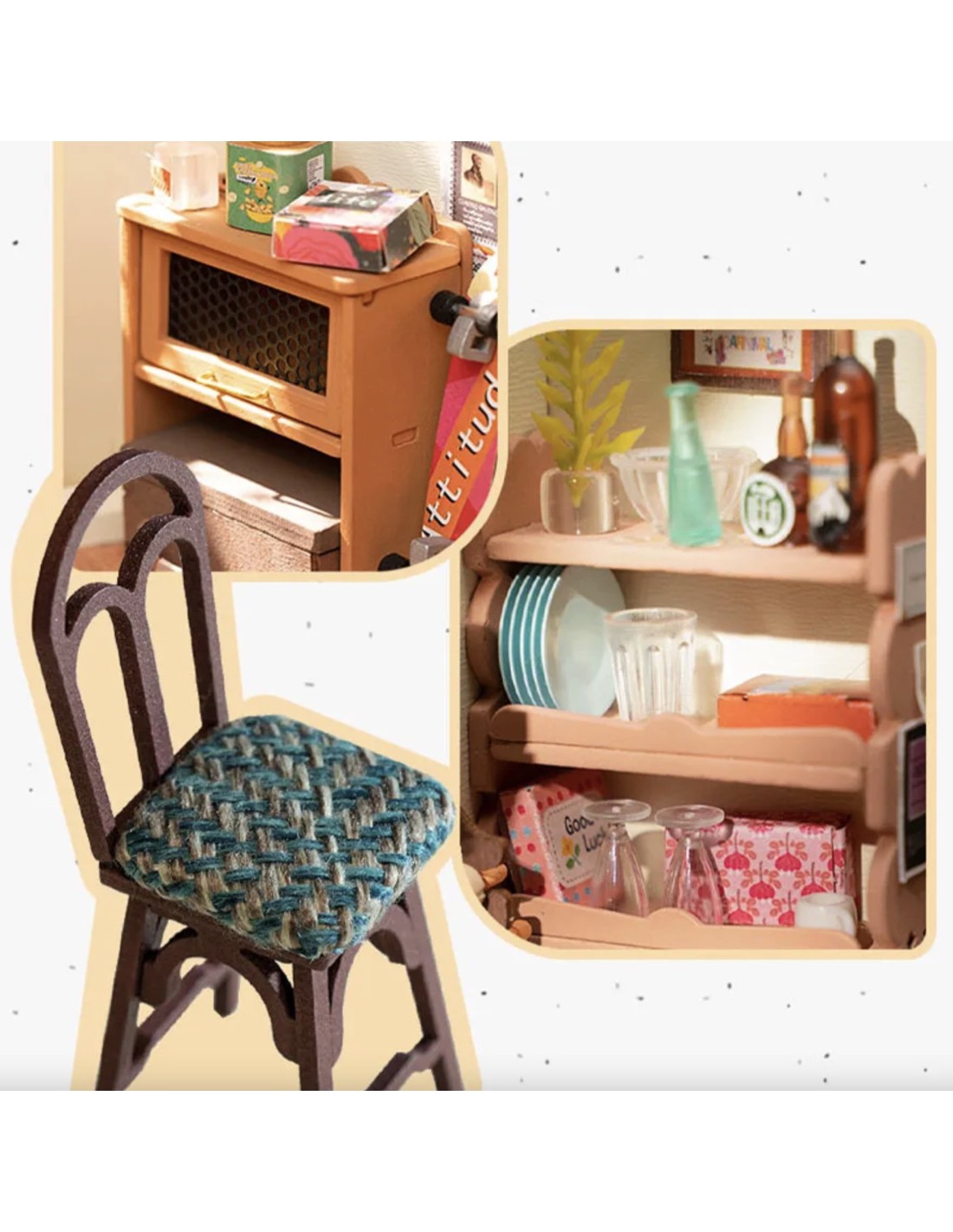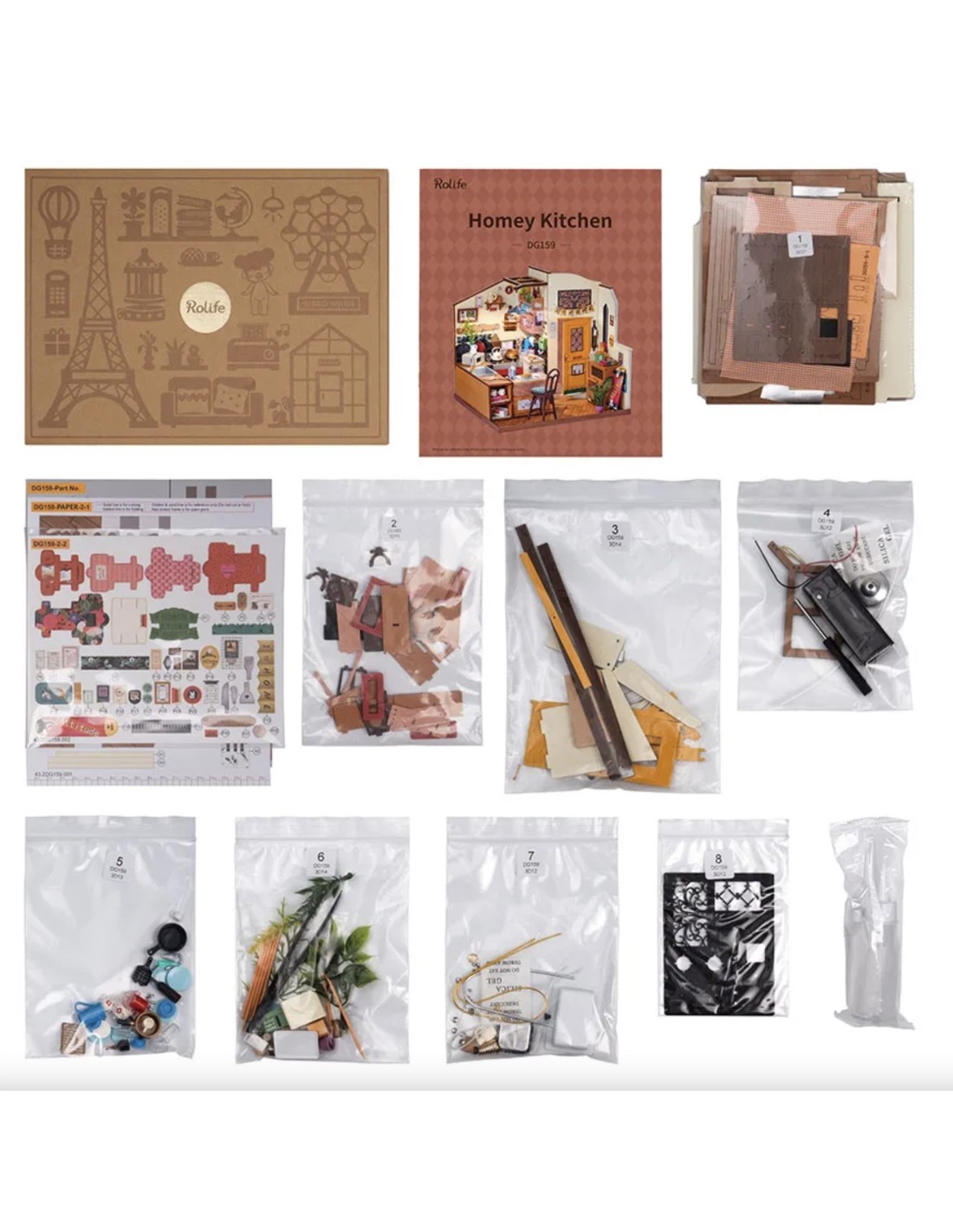 Welcome to Rolife Cozy Kitchen miniature house DG159. It is a kitchen full of warmth, with a classic layout, rich details and charming lighting. What kind of host do you imagine lives here? Maybe he or she is good at baking all kinds of bread and roasts in the oven to fill the days; or maybe there is a sense of satisfaction just looking at these lovely pots and pans, listening to the sound of cups and dishes clashing, the rustling of chopped vegetables, and smelling the aroma of ingredients rising up after being put into the pot! Build this miniature kitchen scene with your hands and enjoy a wonderful DIY experience.