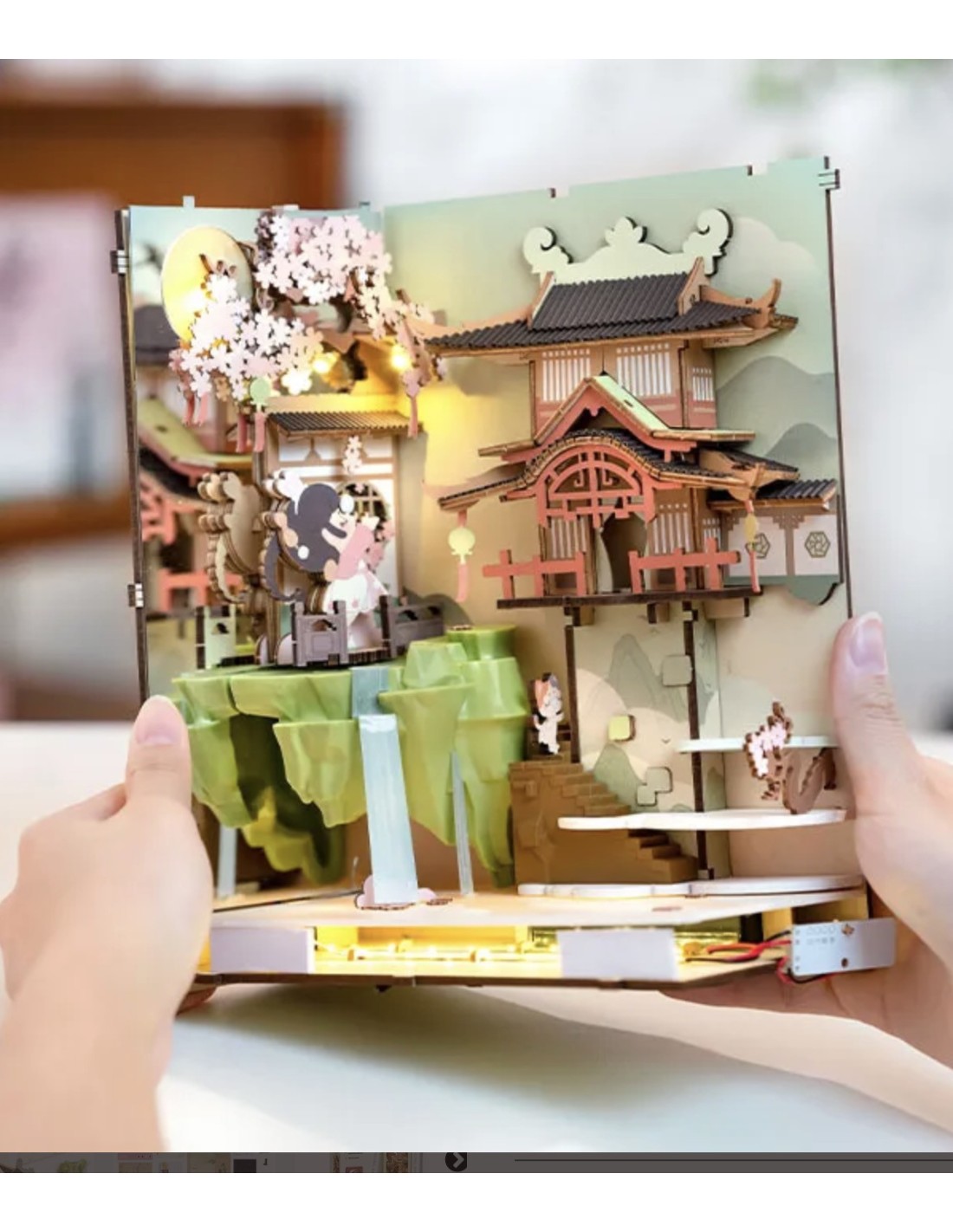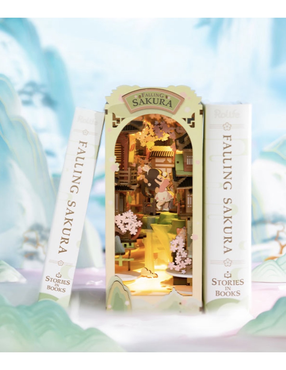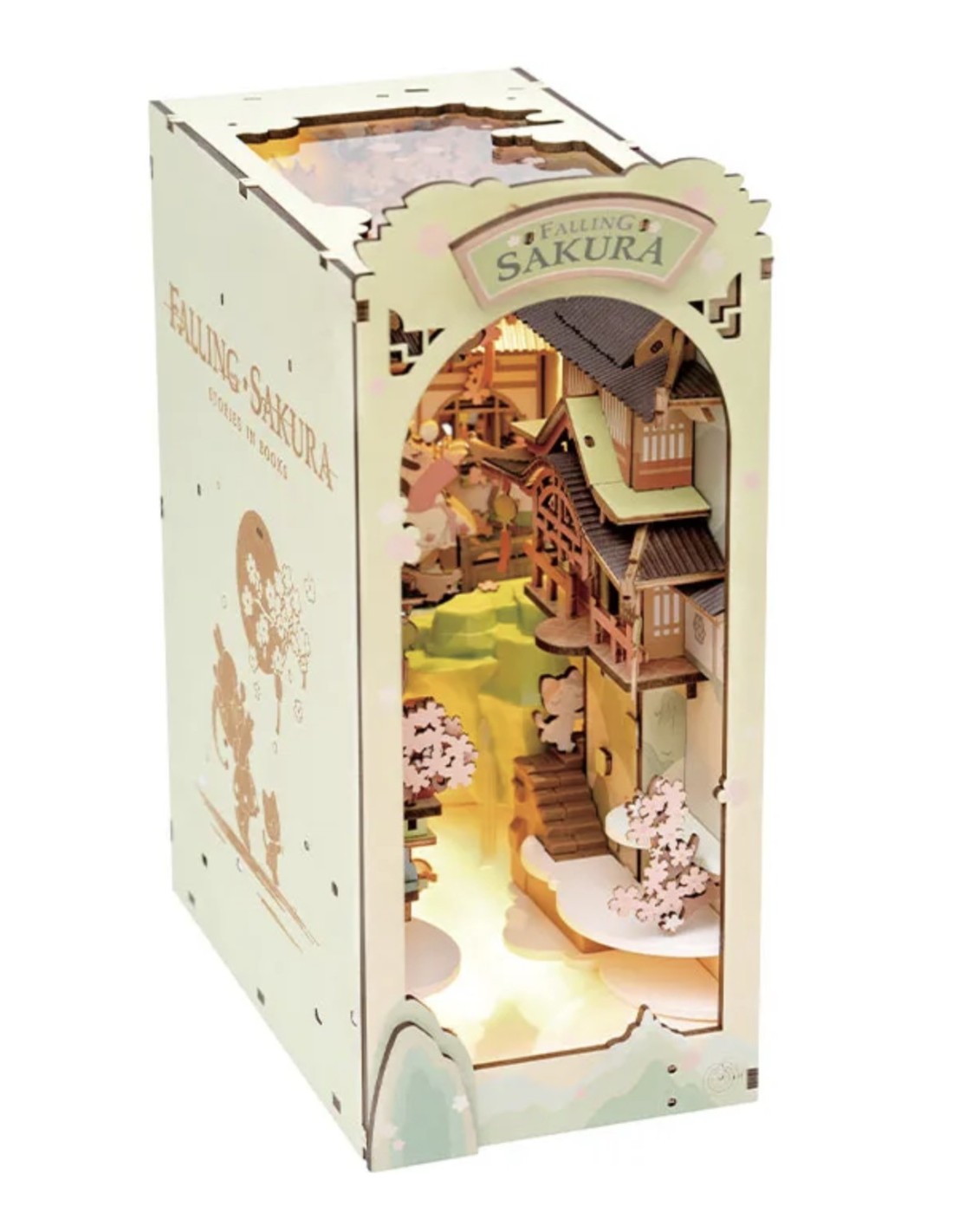 Robotime-Rolife Falling Sakura TGB05 is a creative self-assembly Book Nook kit in the form of a miniature house. We have offered you everything you need to build this mini cherry blossom wonderland – with all the wooden pieces and tools, and you will gradually recover the entire ‘Falling Sakura’ scene, such as the buildings, mountain valley, moon, trees, river, etc. You will feel the spring romance during the fun and immersive assembling process. After you finish, this Falling Sakura book nook kit will also be a unique and exquisite decoration for your bookshelf and office desk. It will look even more beautiful when you put it in the dark with the warm lights on.