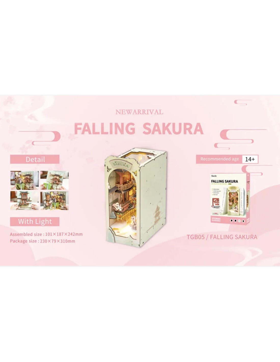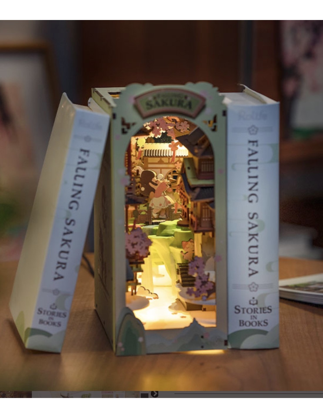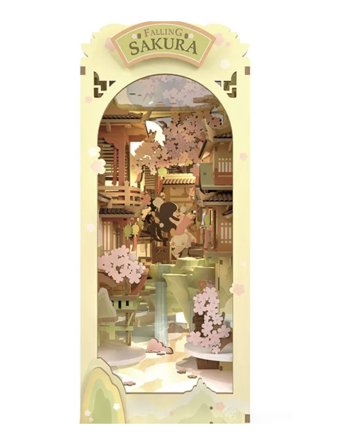 Robotime-Rolife Falling Sakura TGB05 is a creative self-assembly Book Nook kit in the form of a miniature house. We have offered you everything you need to build this mini cherry blossom wonderland – with all the wooden pieces and tools, and you will gradually recover the entire ‘Falling Sakura’ scene, such as the buildings, mountain valley, moon, trees, river, etc. You will feel the spring romance during the fun and immersive assembling process. After you finish, this Falling Sakura book nook kit will also be a unique and exquisite decoration for your bookshelf and office desk. It will look even more beautiful when you put it in the dark with the warm lights on.
