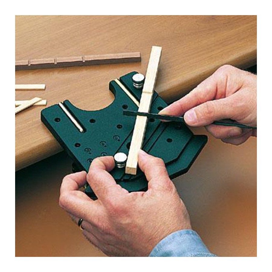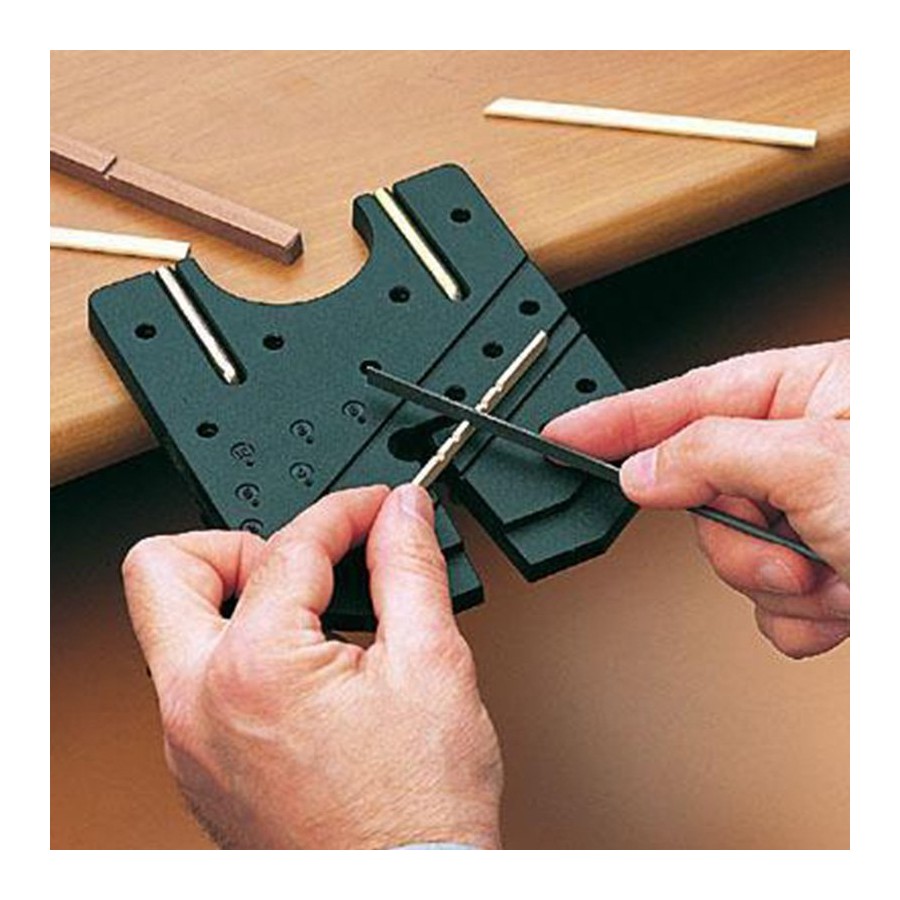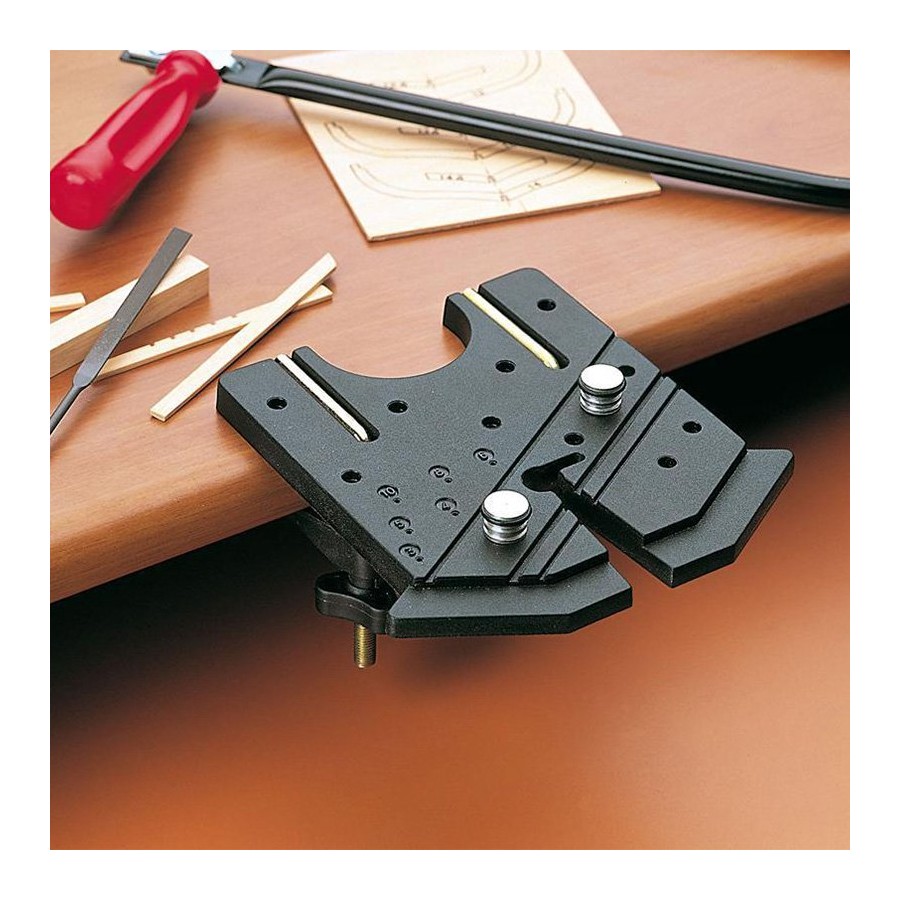 Indispensable para aserrar, limar, agujerear y el acabado. Realizado con material irrompible con pernos guía especiales de aluminio. Incluye dos mordazas para la fijación.