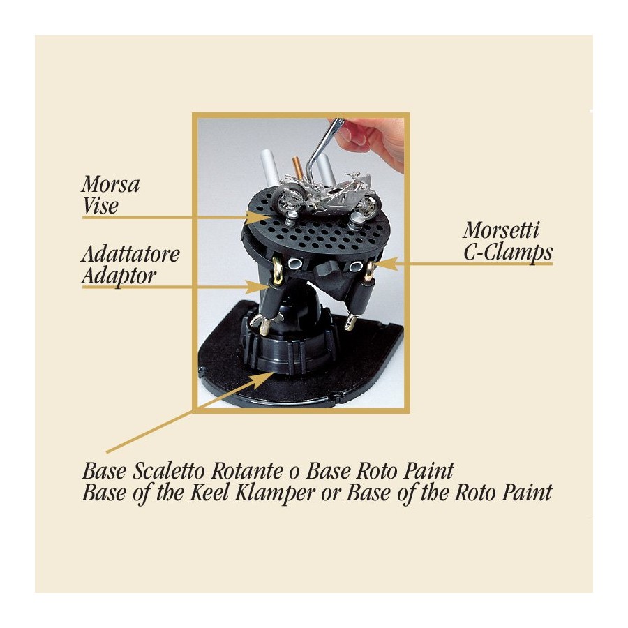 El adaptador especial permite aplicar la mordaza Gripper a la base rotativa del soporte Keel Klamper (7382) o bien a la del Roto Paint (7391).