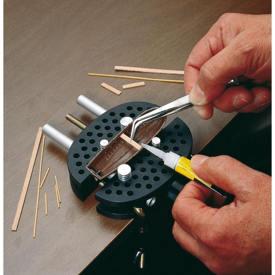 Es suficiente cambiar la posición de los pernos para adaptarlos a la perfección a la forma del objeto. En paquete incluye también dos abrazaderas para la fijación a la mesa de trabajo.