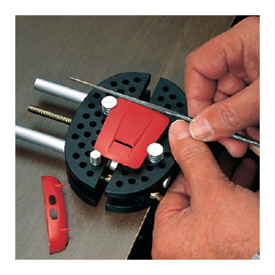Versátil mordaza multiuso adecuada para sostener incluso objetos de forma irregular. La pieza a elaborar se mantiene en posición gracias a cuatro o más pernos, insertados en los agujeros en cada mitad de la mordaza.
