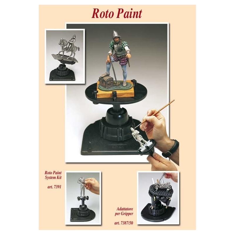 La respuesta profesional al problema de la estabilidad durante el montaje y la pintura de los modelos. El sistema se compone de un soporte rotativo, una empuñadura, dos superficies de apoyo intercambiables y ocho mordazas.