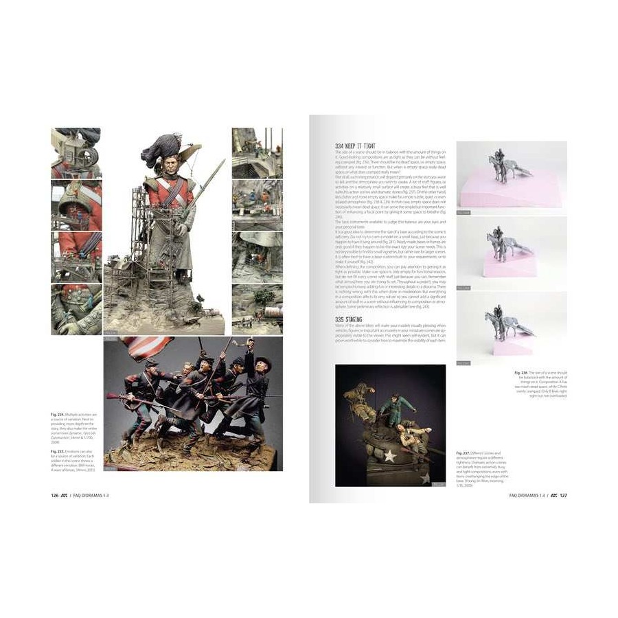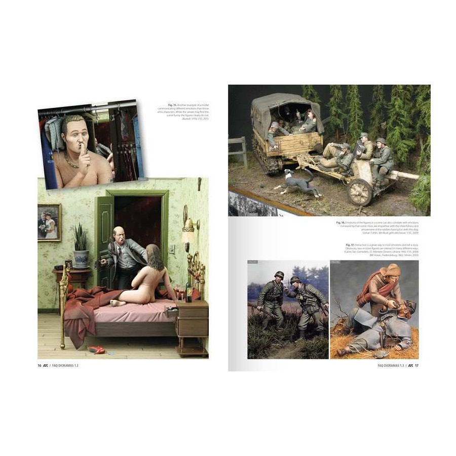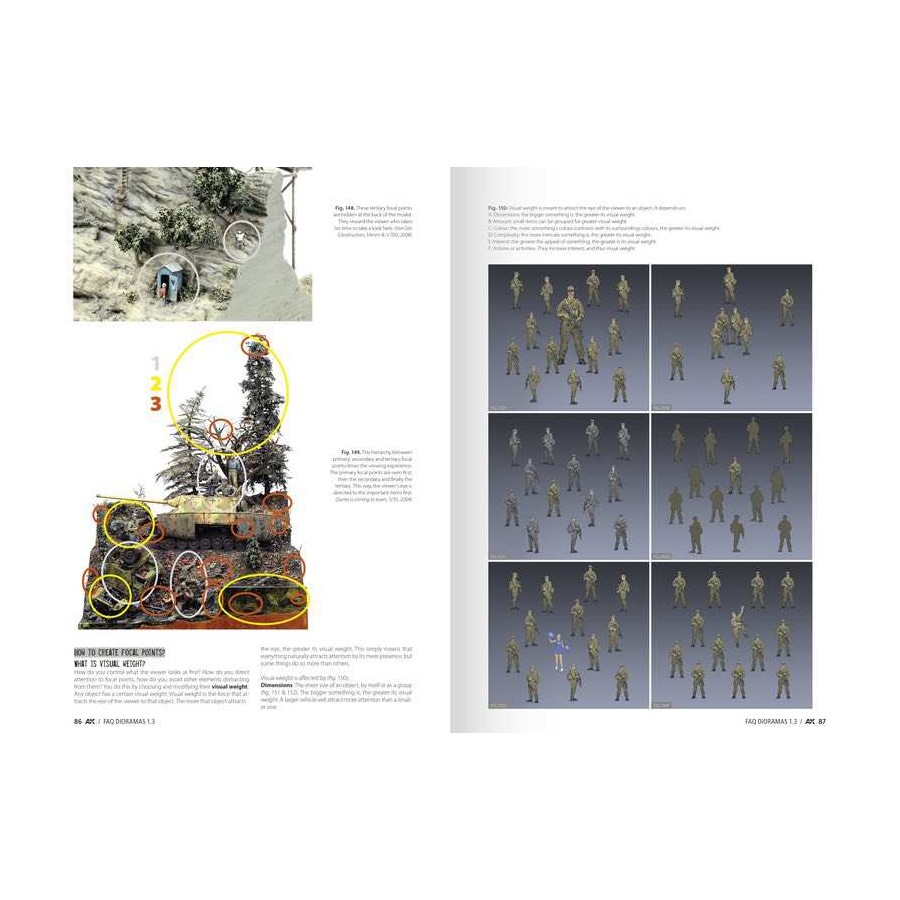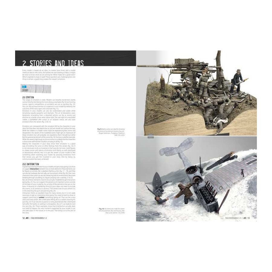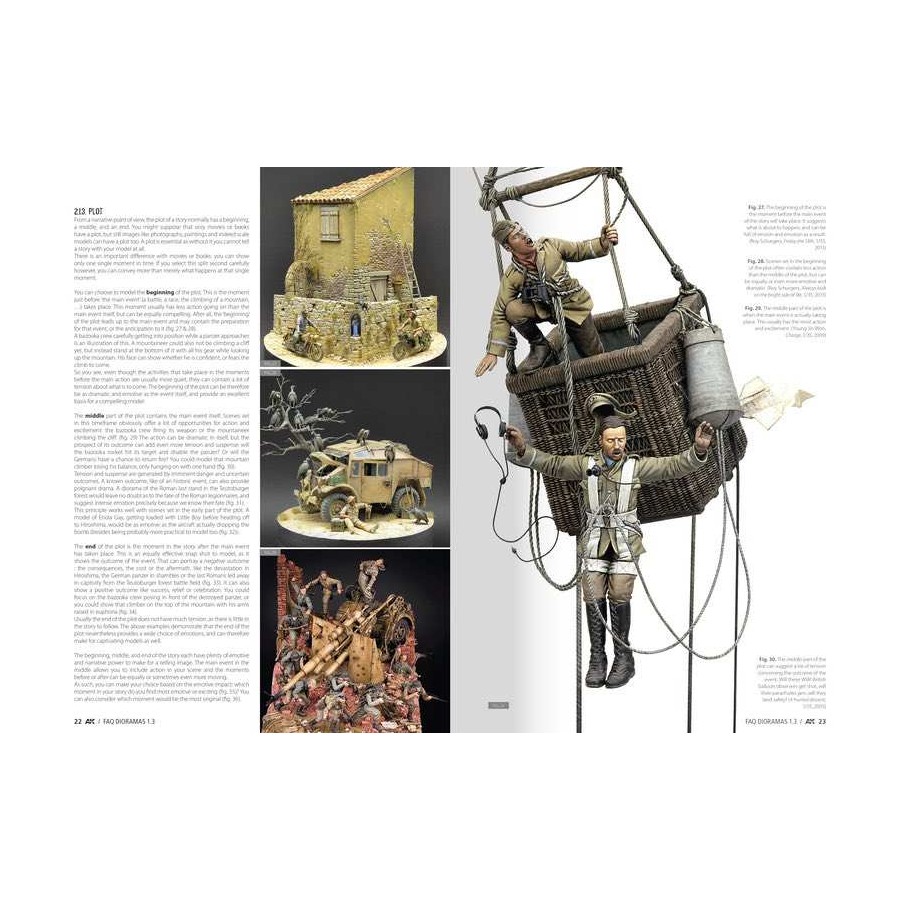 Este anexo 1.3 complementa la serie de libros de Preguntas frecuentes sobre dioramas y explora todos los aspectos del diseño y la planificación de dioramas. ¿Qué es lo que hace una buena historia y cómo puedes transmitirla con modelos? ¿Dónde puede encontrar una buena idea y cómo puede desarrollar esa idea en un proyecto exitoso? ¿Cómo puedes componer un diorama para que cuente mejor su historia y se vea bien al mismo tiempo? ¿Cómo puedes usar colores, figuras, accesorios, escenarios y bases de manera efectiva en tu composición? ¿Cómo convertir una fotografía histórica en una escena tridimensional? ¿Cómo planeas una caja de diorama? Este tema aparentemente teórico se trata de la manera más práctica, haciéndolo accesible y útil para todos los modeladores.