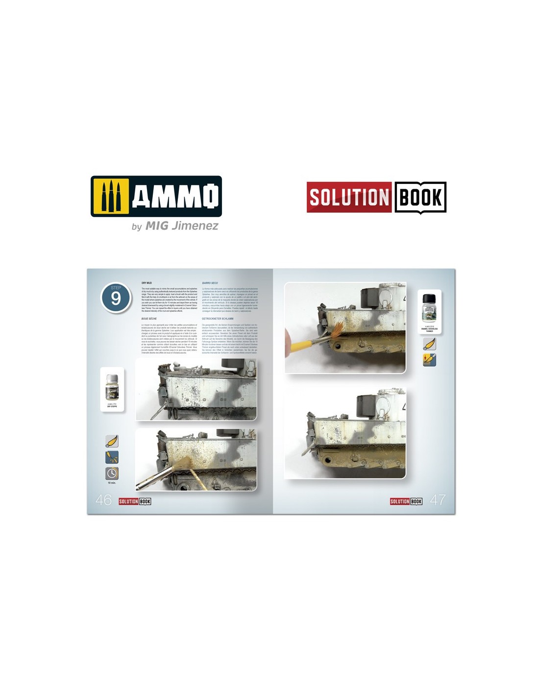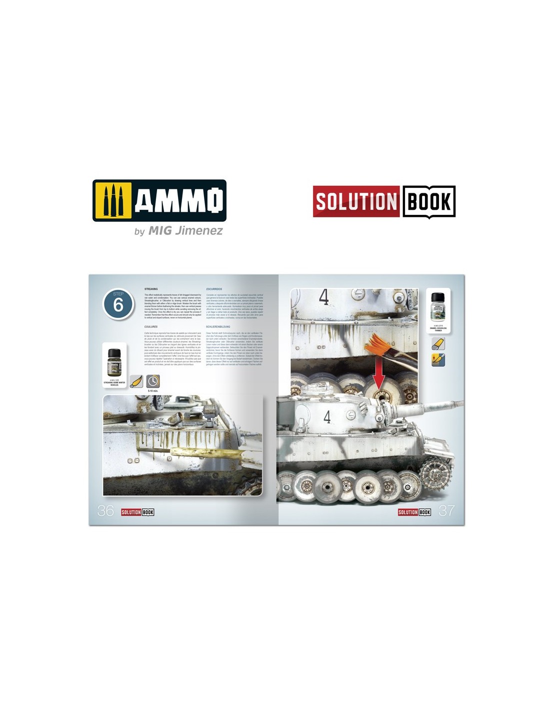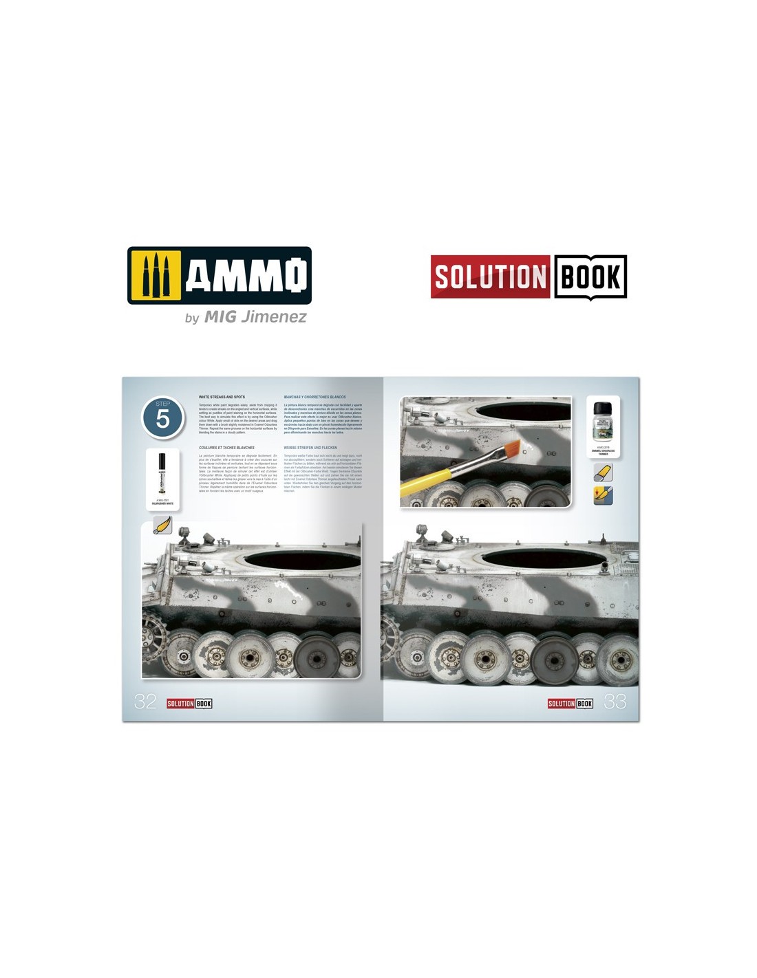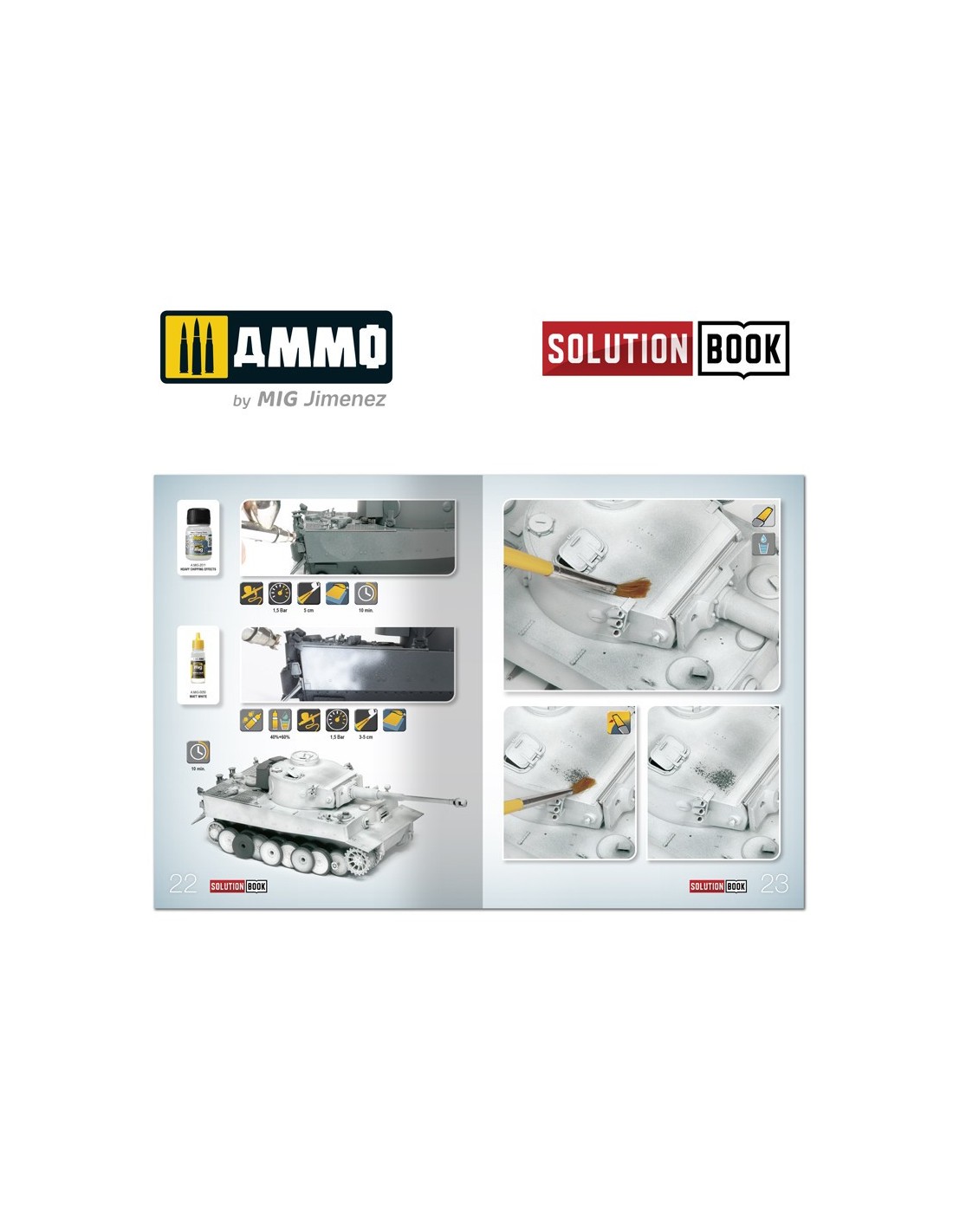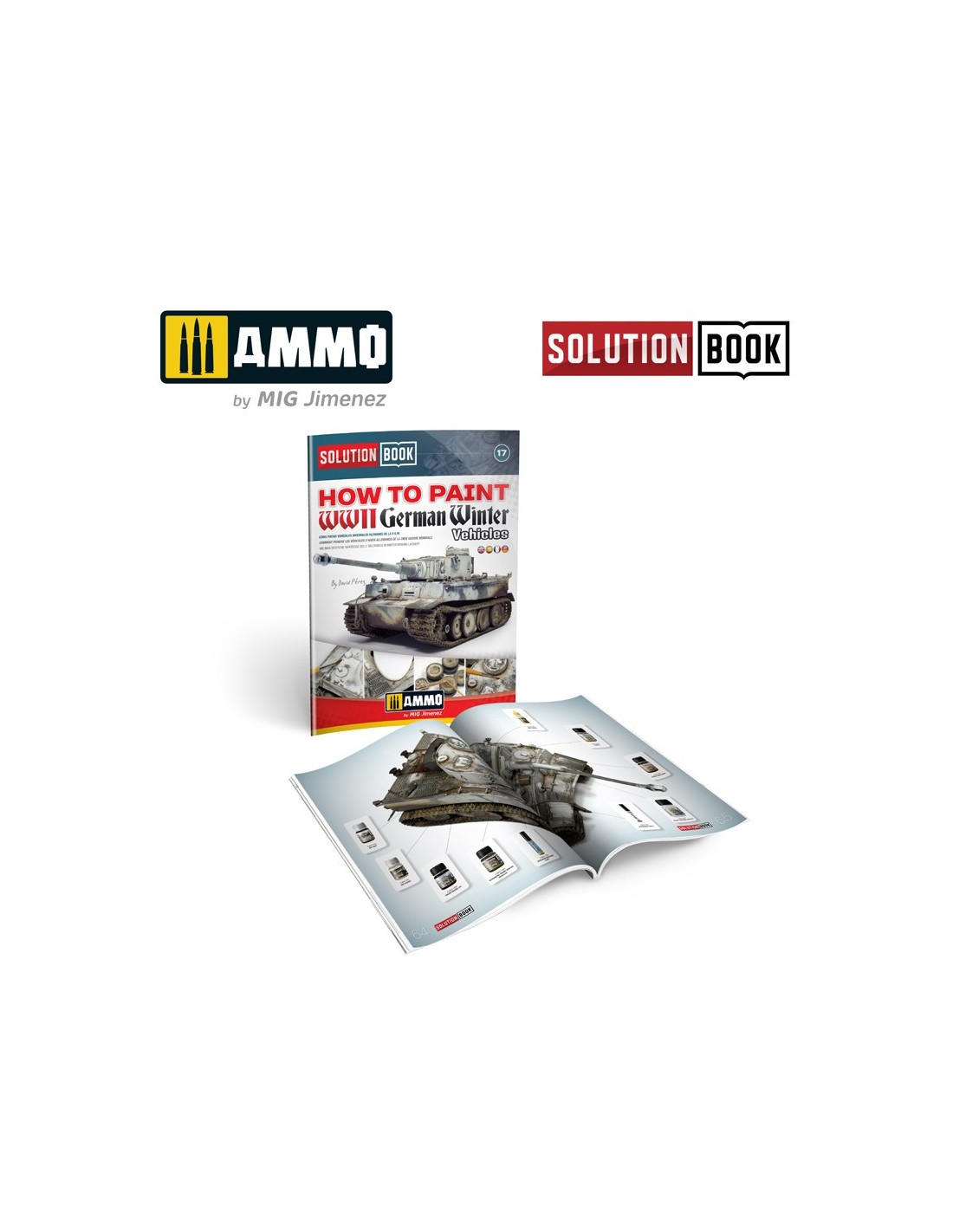 SOLUTION BOOK - Cómo pintar vehículos invernales alemanes de la II Guerra Mundial, con textos explicativos en cuatro idiomas (inglés, castellano, francés y alemán). Una sencilla guía de 67 páginas fácil de seguir que explica paso a paso cómo aplicar los efectos más habituales en los vehículos militares alemanes con camuflaje blanco durante los meses invernales de la II Guerra Mundial. Con esta guía cualquier modelista puede llegar a obtener efectos y acabados similares a los de los ejemplos que se muestran. No importa si eres un modelista principiante que acaba de empezar o un modelista más avanzado y con experiencia. Con esta guía podrás lograr efectos asombrosos con muy poco esfuerzo, simplemente siguiendo unos sencillos pasos.
