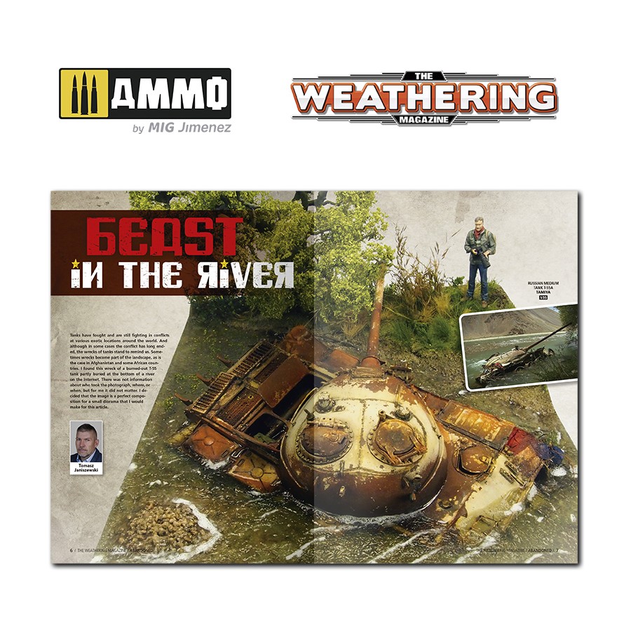 El último número de tu revista favorita es un auténtico regalo para los fanáticos del envejecido extremo. Nos centraremos en los vehículos abandonados; los vehículos militares, aviones y mechas abandonados nos proporcionan una gran oportunidad para mostrar los múltiples efectos de envejecido acumulados en diferentes condiciones y entornos durante largos períodos de tiempo. Constituyen el lienzo perfecto para aprender, practicar y ampliar nuestras técnicas de envejecido: óxido, pintura desconchada, escurridos y mucho más tienen cabida en este número. Como se muestra en el artículo titulado Beast in the River (La bestia en el río), con los fuertes desgastes de óxido y pintura de un T-55 abandonado en un río en Afganistán. Radioactive Rust (Óxido radioactivo) presenta efectos similares en un ambiente menos húmedo mediante un ZIL 131 a 1/72 abandonado en un entorno urbano, a la vez que ilustra la forma en que la naturaleza va recuperando lentamente un vehículo abandonado y sus alrededores. Un T-54 de AMMO sirve como base para hacer un carro iraquí abandonado en la Autopista de la muerte, expuesto a condiciones extremas de calor y aridez. Derelict (Abandonado) muestra un T-33A abandonado y muy desgastado, no sólo en el exterior sino también en el interior de la cabina. MSN - 03 Sazabi Abandoned (MSN - 03 Sazabi abandonado) nos muestra un mecha de una forma diferente. Estos vehículos suelen presentar un estilo de pintura limpio propio del anime, pero este robot ha quedado abandonado y sin piloto, con fuertes acumulaciones de polvo y óxido, ya que es el centro de atención de un diorama en el que también se quiere transmitir la destrucción causada por el mecha en una vivienda cercana. Finalmente, Sweet Retirement (Un dulce retiro) nos muestra los efectos del abandono en un Chieftain que no se perdió en combate, sino que ha quedado expuesto al público y sin mantenimiento. En todos estos artículos descubrirás consejos y técnicas que podrás probar en tus maquetas. Una magnífica fuente de inspiración para tus técnicas de envejecido, tanto si acabas de empezar como si eres un modelista experimentado.