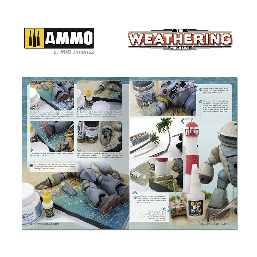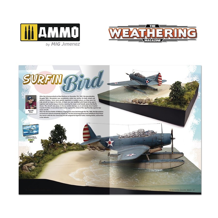 El último número de tu revista favorita se centra en un paisaje emblemático: la playa. Un decorado estupendo para nuestras maquetas y dioramas, a la vez que proporciona grandes oportunidades narrativas y de envejecido en multitud de temáticas diferentes. Por ejemplo, como escenario de una batalla de ciencia ficción: en “Battle on the Beach” se muestra el resultado de un enfrentamiento entre dos mechas anfibios, el MSM-07 Gok Production y el MSM-04 Acguy. Mientras que “Surfin Bird” presenta una escena mucho más pacífica protagonizada por un hidroavión Douglas TBD-1A posado en el agua, así como los efectos del envejecido causados por el agua salada y la arena en los aviones y la transición entre la arena y la vegetación. Una playa menos tranquila es el decorado del artículo “Boat that Won the War”, que muestra cómo recrear un fuerte oleaje y un LCVP atrapado en él. Mostramos también un paso a paso del vehículo de asalto anfibio AAVP7A1 RAM/RS, especialmente los efectos de la humedad y la arena en las orugas propias de los blindados anfibios. “What Lies Beneath” muestra las defensas costeras alemanas de Francia en 1944, cómo pintar y desgastar su camuflaje y cómo representar el entorno elevado vigilando las playas. “The Lonely Bay” presenta una vista más panorámica y explica cómo crear la ilusión de profundidad en el mar y las olas rompiendo en la costa. Por último, el artículo “Wading Sherman” está dedicado a un Sherman a escala 1/72 parcialmente sumergido.