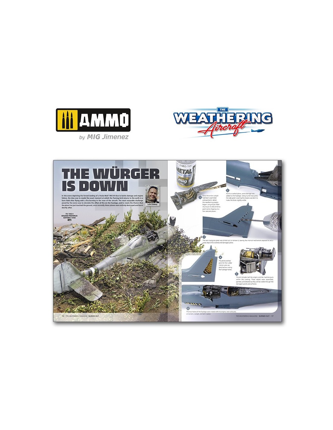 El último número de tu revista favorita se centra en el tema Quemado: la conflagración y destrucción producidas por la guerra en maquetas de todos los géneros. Esto proporciona un amplio abanico de posibilidades de pintura y envejecido, así como narrativas. Como en el T-72B ruso quemado que aparece en el artículo "Ukranian Rebel", con el que se explican no sólo técnicas de pintura y envejecido, sino también cómo modificar la maqueta de un carro de combate para hacer daños. En una línea similar, "The Würger is Down" muestra cómo crear daños en un FW 190D-9 destrozado durante un aterrizaje forzoso y en su entorno. Mientras que "Abrams in Ashes" presenta un M1A1 Abrams durante la operación Tormenta del desierto, víctima del fuego propio o destruido para para evitar su captura por el enemigo. Los edificios tampoco pueden evitar los daños causados por los combates. Franck Cournede nos muestra las técnicas necesarias para representar un edificio dañado. A continuación, "The Fallen Soldier" explica paso a paso las diferentes técnicas de desgaste aplicadas a un tema de ciencia ficción, un mecha; una gran oportunidad para realizar un envejecido extremo en un entorno ficticio. A continuación, nos centraremos en el legendario Jagdpanzer IV/70 (A) para realizar varias técnicas de envejecido, a la vez que se muestra el interesante contraste que podremos lograr combinando una parte del camuflaje intacto con otra quemada como resultado de un impacto. Por último, Mig Jiménez muestra cómo trabajar los daños causados por el fuego en un barco a escala 1/700 en el artículo "Exocet Inferno, HMS Sheffield Ablaze", utilizando fotografías de la nave real para crear un resultado fiel y realista. No importa cuál sea la temática de tus modelos quemados, no hay duda de que este nuevo número de The Weathering Magazine te inspirará en tus proyectos.
