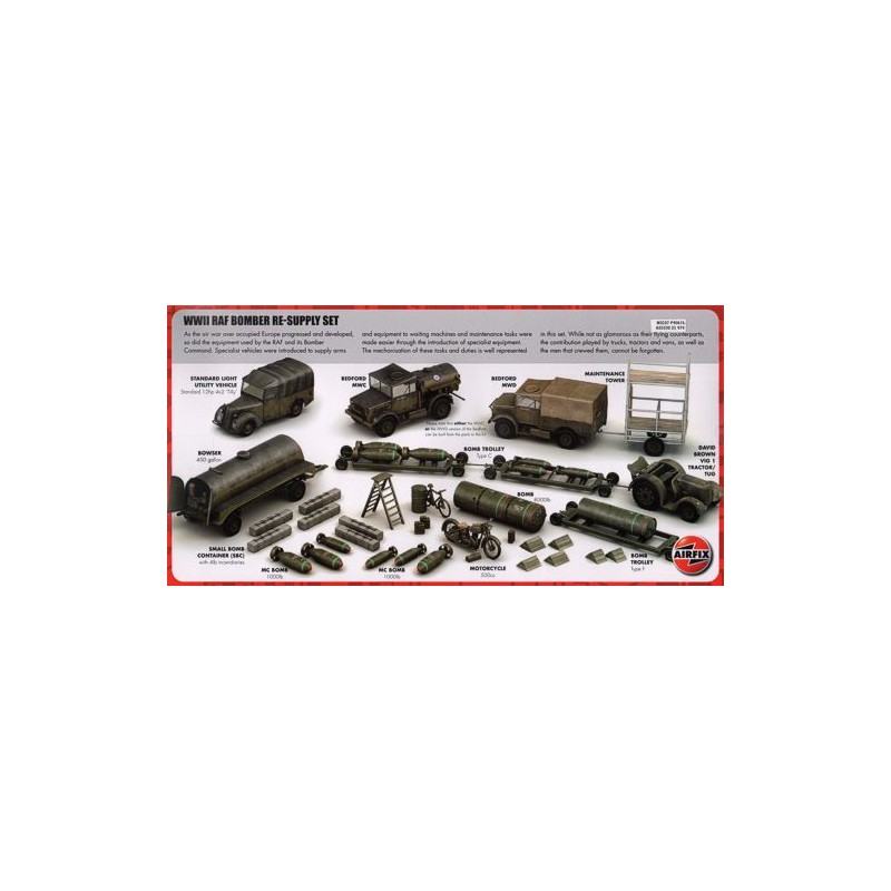 Includes: Various different sizes of bombs: 1,000lb, 500lb, 4,000lb and 8,000lb Detailed incendiary bombs Detailed trolleys and tractor Options for Bedford MWD and MWC trucks Detailed maintenance towers Various accessories such as chocks, bicycle and ladders Standard Tilly