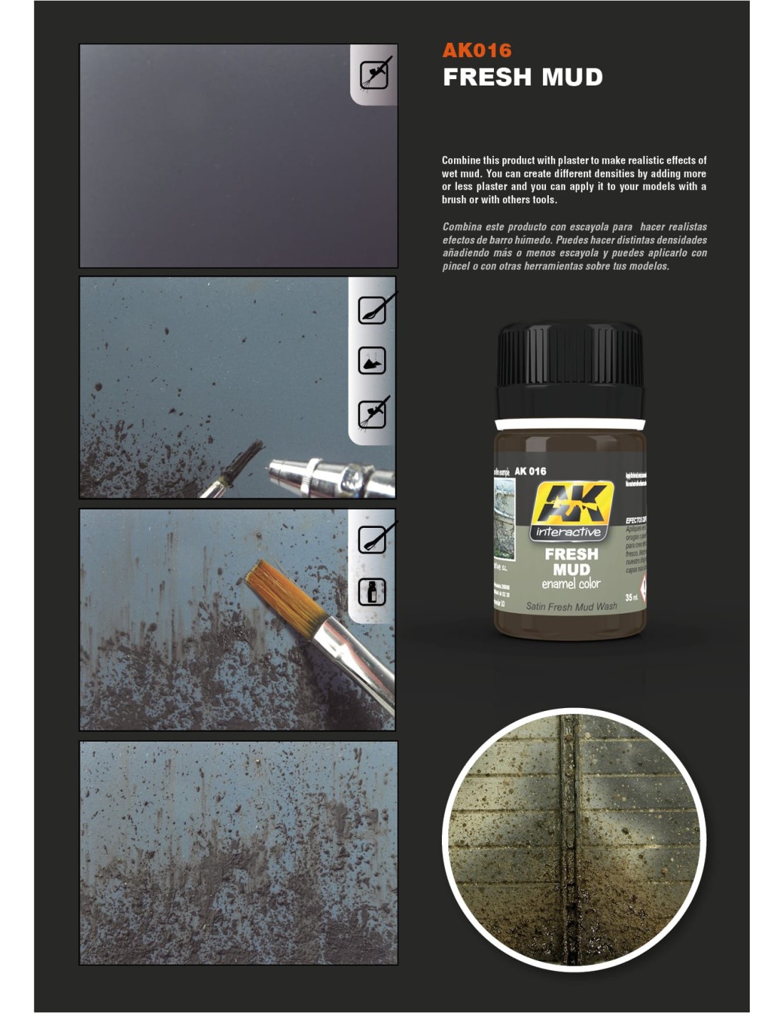 Lavados esmalte para hacer lavados de efectos naturales, como polvo, tierra oscura o barro fresco. Solamente aplica el producto en tu tanque, ruedas, orugas y chasis para conseguir los efectos más realistas. También los puedes mezclar con escayola para hacer barro con un poco de volumen y textura.