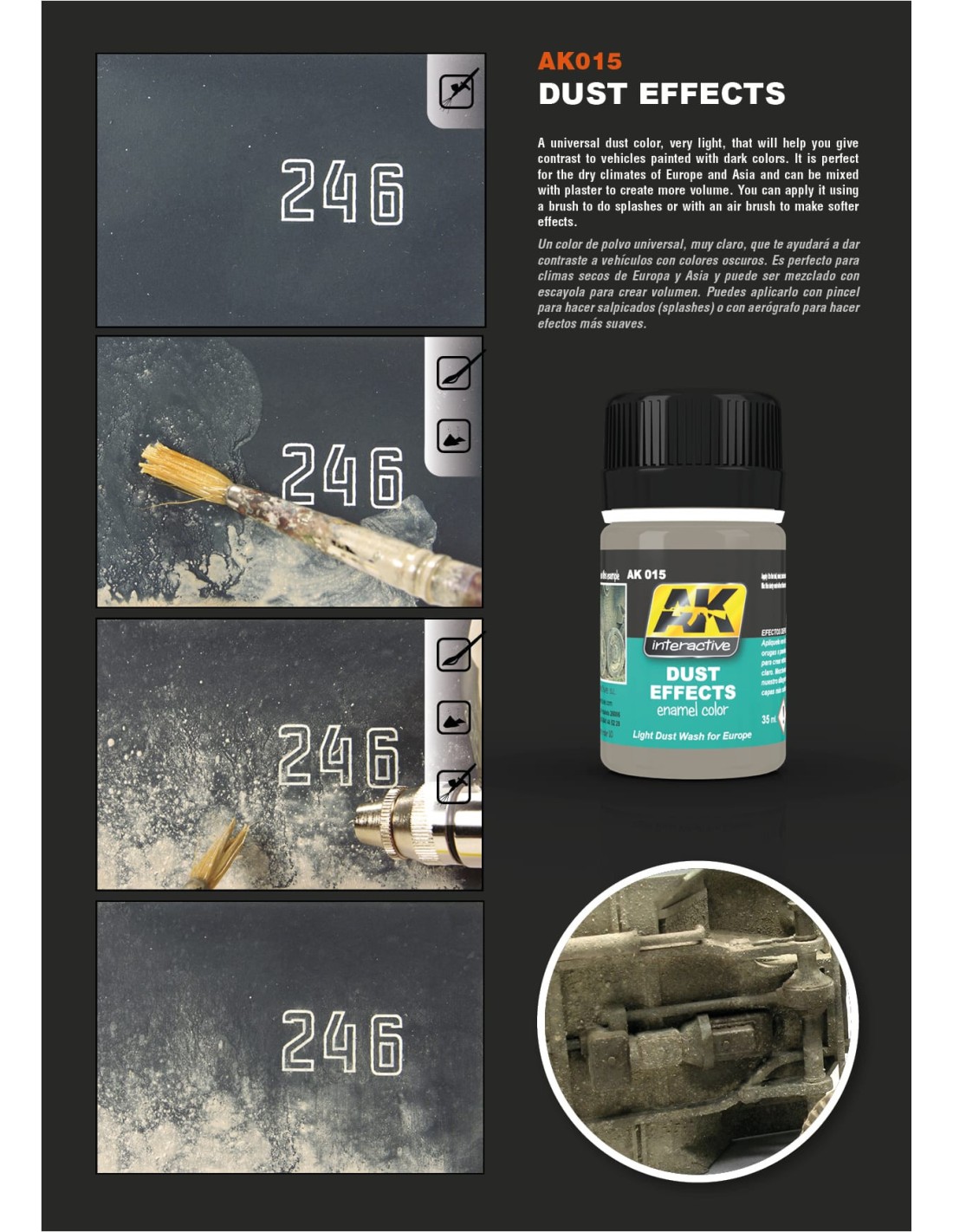 Lavados esmalte para hacer lavados de efectos naturales, como polvo, tierra oscura o barro fresco. Solamente aplica el producto en tu tanque, ruedas, orugas y chasis para conseguir los efectos más realistas. También los puedes mezclar con escayola para hacer barro con un poco de volumen y textura.