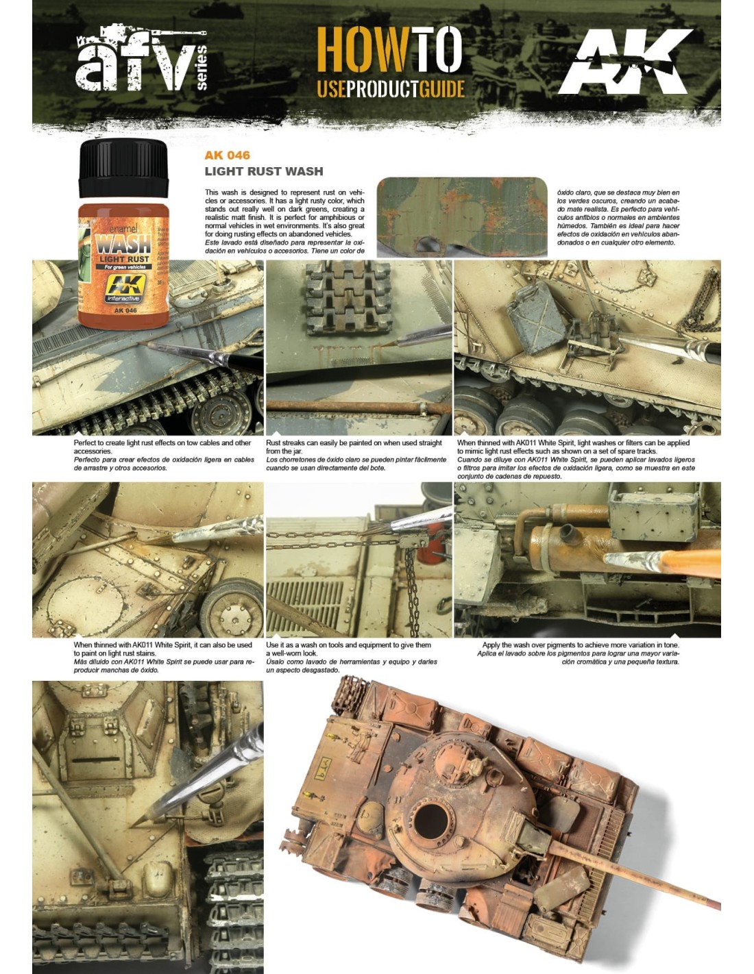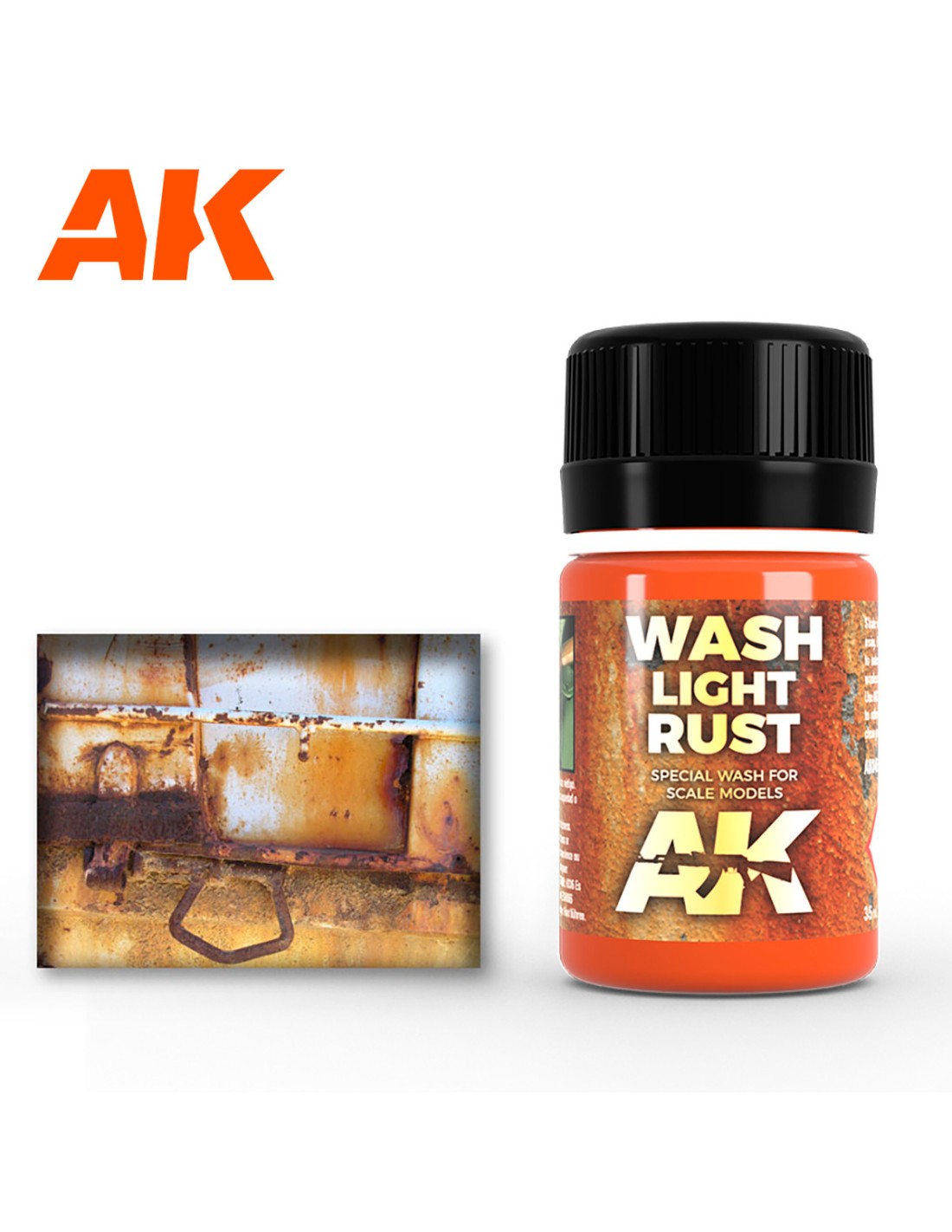 El segundo lavado de AK Interactive esta destinado a representar los efectos de óxido en vehículos pintados en color verde. Es un color de óxido claro, que destaca sobre el color verde oscuro con gran realismo. El resultado es mate. Es perfecto para vehículos anfibios o en entornos húmedos, así como para hacer efectos de óxido en vehículos abandonados.