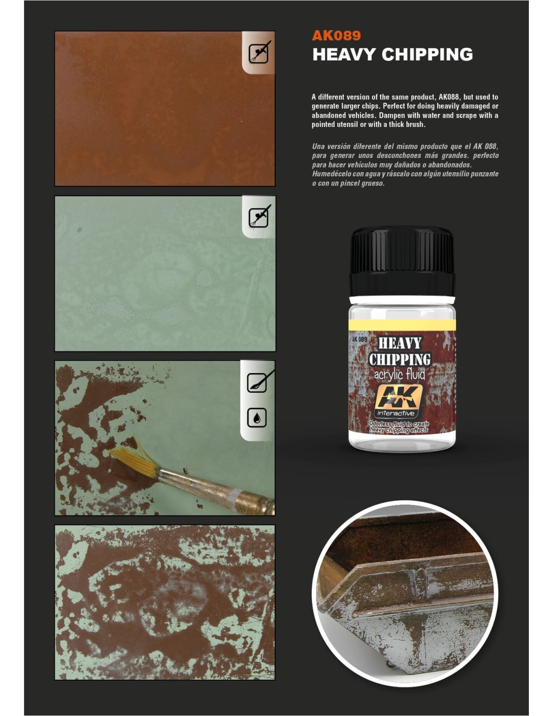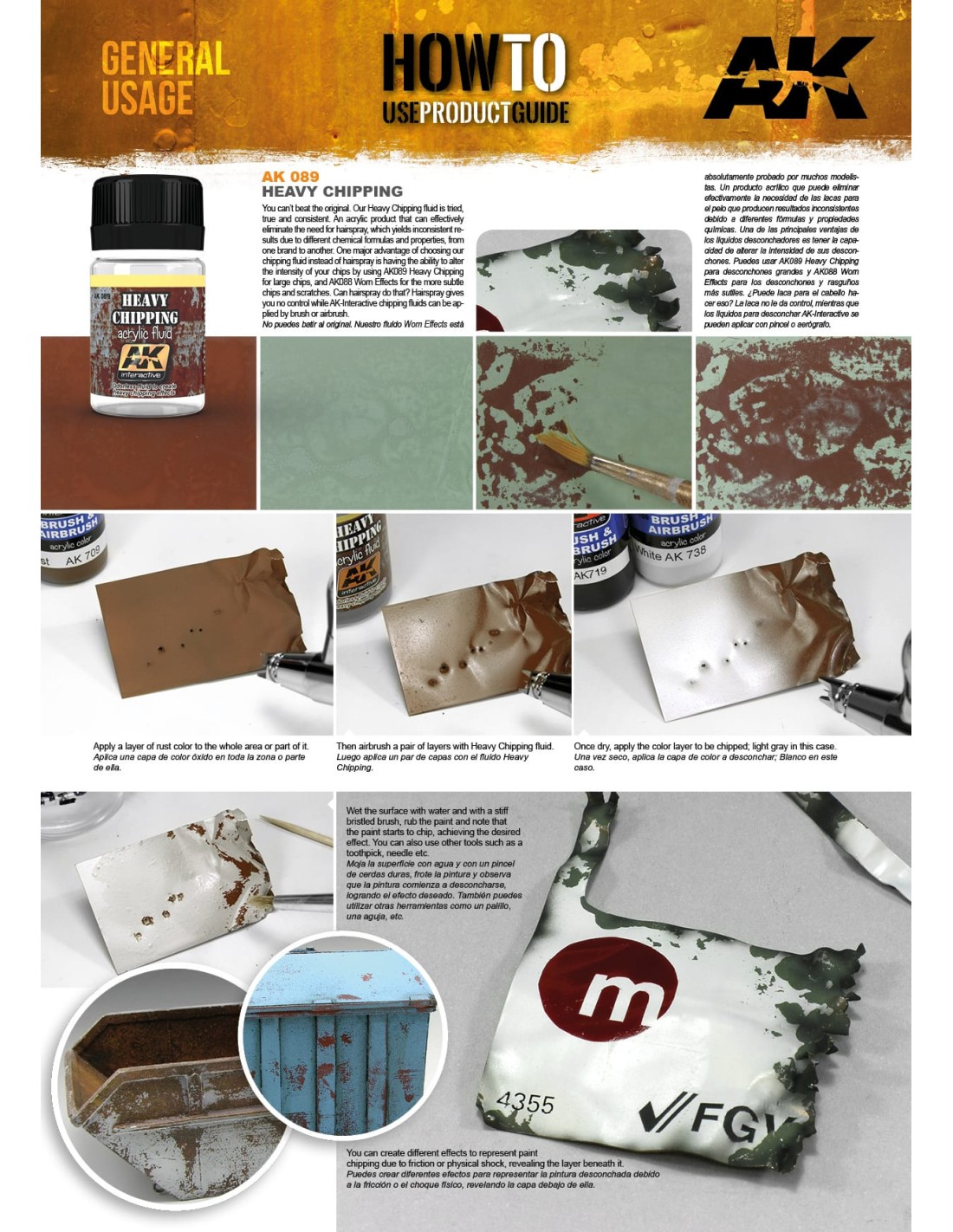 Por primera vez, un producto acrílico, inodoro y eficaz para reemplazar a la laca y hacer efectos de grandes desconchones en nuestros modelos. primero pintaremos nuestro modelo en un color oscuro o el que queramos que se vea debajo del desconchón. Después aplica directamente en el aerógrafo y daremos una generosa capa a nuestro modelo. Después pintamos con un color acrílico encima y podremos hacer pequeños efectos de desgaste humedeciendo la superficie con un pincel y después haciendo los efectos con algún efecto punzante o el mismo pincel. No te arriesgues con una laca cualquiera, asegura el resultado de tu maqueta con este nuevo producto.