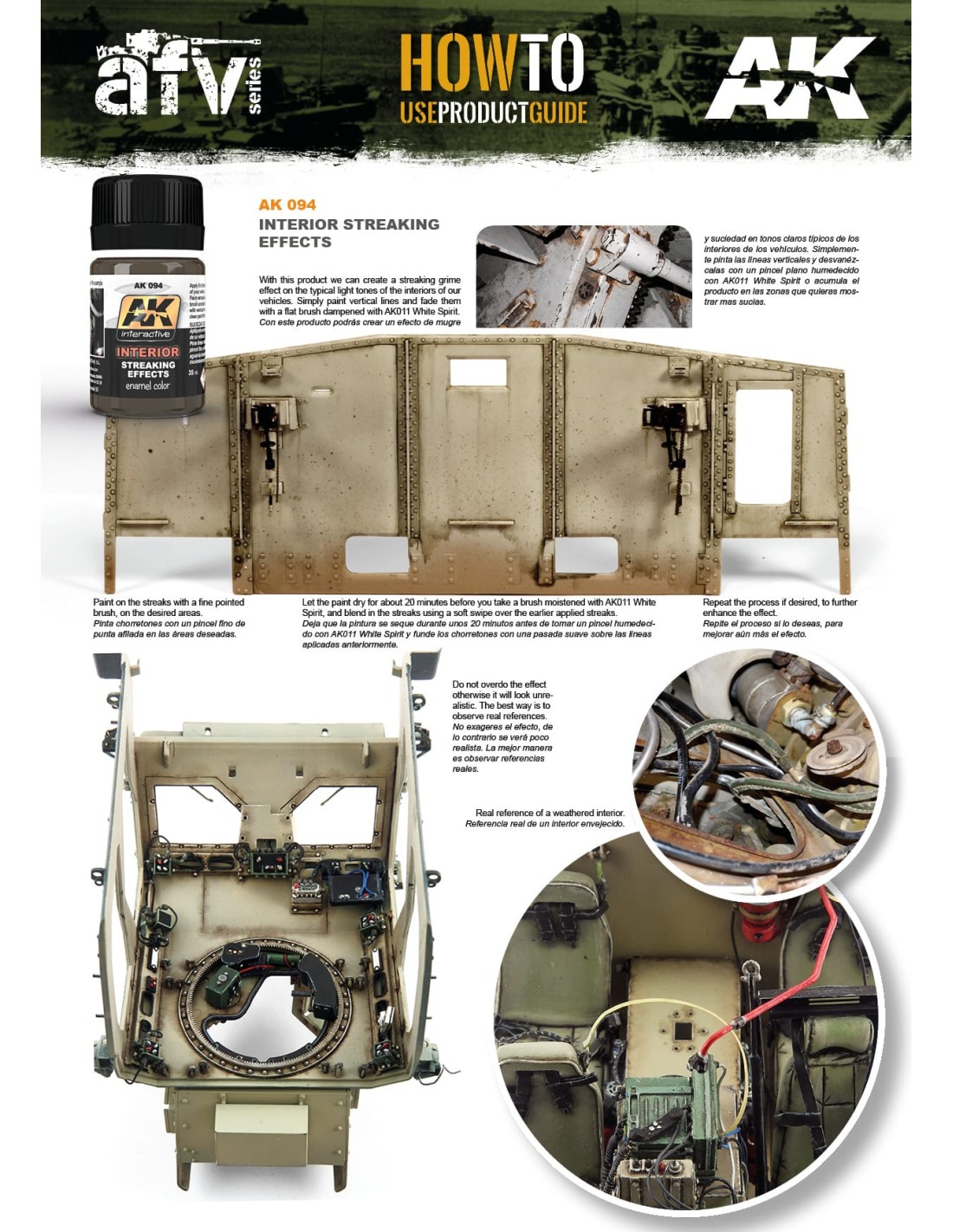 Con este esmalte podremos realizar efectos de suciedad escurrida en los tonos claros del interior de nuestros vehículos, como el RAL 9001 Cremeweiss o el blanco. Solo hay que pintar líneas verticales y difuminarlas con un pincel plano humedecido en White Spirit.