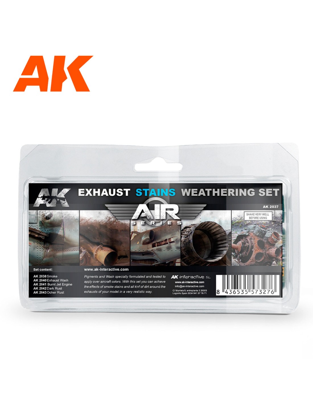 Este set de weathering, perteneciente a la nueva línea de productospara aviones AIR Series, se centra en los escapes y propulsores de aviones, está especialmente formulado por nuestro departamento artístico para dar mas realismo a tus modelos de aviones. Son pinturasy pigmentos, de gran calidad, que se pueden disolver con nuestro White Spirit y que facilitan enormemente el envejecido y realismo. Este set incluye un lavado y 4 pigmentos:AK2038 Smoke, AK2040 Exhaust Wash, AK2041 Burnt Jet Engine, AK2042 Dark Rust y AK2043 Ocher Rust.
