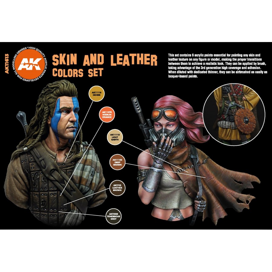 Este set contiene 6 pinturas acrílicas imprescindibles para pintar cualquier piel y textura de cuero en cualquier figura o modelo, realizando las transiciones adecuadas entre ellas para lograr un aspecto realista. Se pueden aplicar con brocha, aprovechando la alta cobertura y adherencia de 3a generación. Cuando se diluyen con diluyente específico, se pueden retocar con aerógrafo tan fácilmente como las pinturas a base de laca.