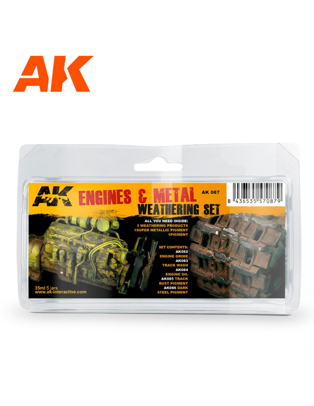Este set contiene todo lo necesario para conseguir efectos muy realistas en motores de cualquier tipo y objetos de metal, como las orugas de los tanques. Para los motores hay dos colores para hacer efectos de suciedad y de grasa, que dan un aspecto muy real y creíble. Para los metales y orugas hemos diseñado un lavado, un pigmento de óxido oscuro y un pigmento súper metálico que no tiene equivalente en ninguna otra marca de pigmentos. Este pigmento de color acero es altamente brillante cuando se frota. Cuanto más lo frotas, más brilla. Además, este pigmento ultra fino no contiene partículas metálicas como los otros productos del mercado. Consigue un aspecto de acero real como nunca antes lo has visto