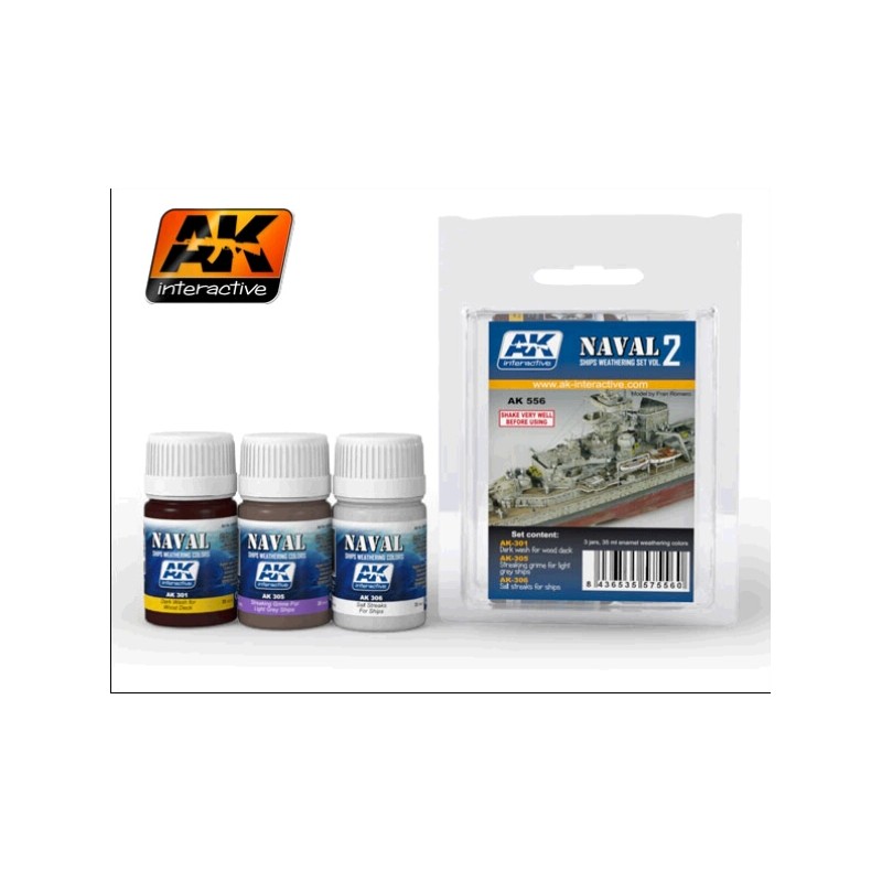 Este set contiene los productos AK-301 Lavado oscuro para cubiertas de madera, AK-305 Chorretones de suciedad para barcos gris claro y AK-306 Chorretones de sal para barcos.