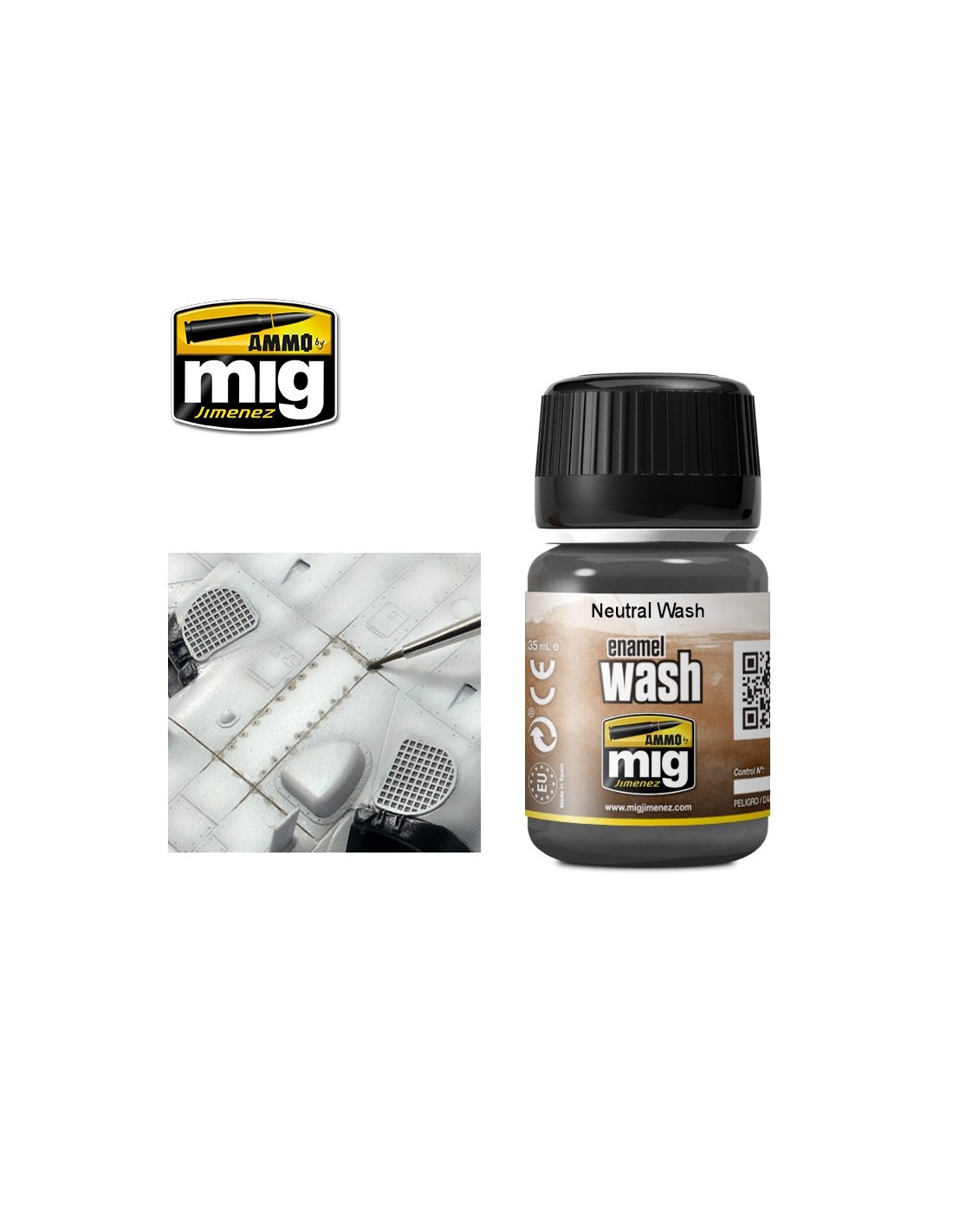 Lavado de color gris para uso general, especialmente adecuado sobre colores como el blanco o grises claros. Aplicar en los detalles y quitar el exceso con un pincel limpio humedecido en A.MIG-2018 Diluyente para Esmaltes.