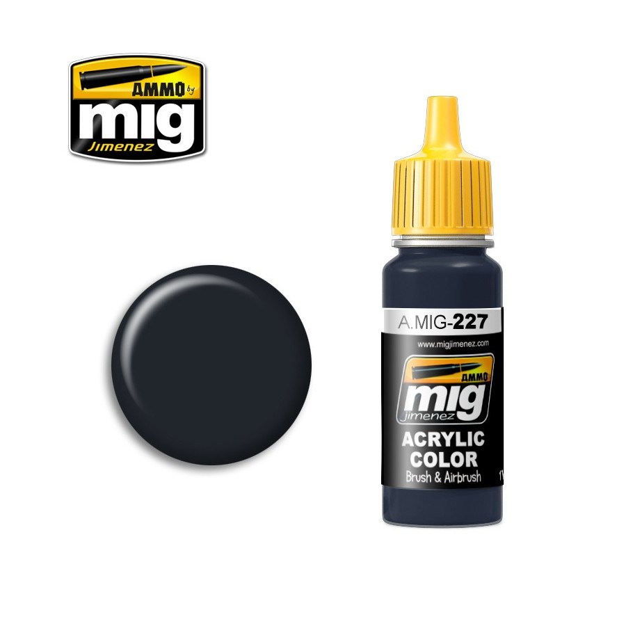 El color Sea Blue FS 25042 ( ANA 606 ) ha sido estudiado con precisión hasta dar con el tono perfecto para pintar el camuflaje de tres tonos de los aviones de la USN y USMC en escenario del Pacífico desde 1940 hasta 1945, como por ejemplo los F4U, F6F, SBD Dauntless y otros. Color real con una fórmula optimizada para obtener el máximo rendimiento tanto con pincel como con aerógrafo y con Efecto de Reducción de Escala que nos permitirá conseguir el color adecuado en nuestras maquetas. Cada bote incluye un agitador de acero inoxidable para facilitar una mezcla más rápida y homogénea. Presentación en botes de 17mL. Soluble en agua, sin olor y no tóxico. Agite bien antes de cada uso. Recomendamos A.MIG-2000 Acrylic Thinner para una correcta disolución. Secado completo en 24h.