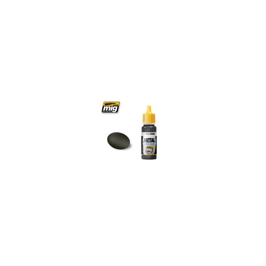 Color perfecto para representar el color de los cañones, metales de herramientas y armas pavonadas de manera realista y efectos metálicos de todo tipo. Pintura acrílica con una formula optimizada para obtener el máximo rendimiento tanto con pincel como con aerógrafo - 17ml. Soluble en agua, sin olor y no tóxico. Agite bien antes de cada uso. Recomendamos A.MIG-2000 Acrylic Thinner para una correcta disolución. Secado completo en 24h.