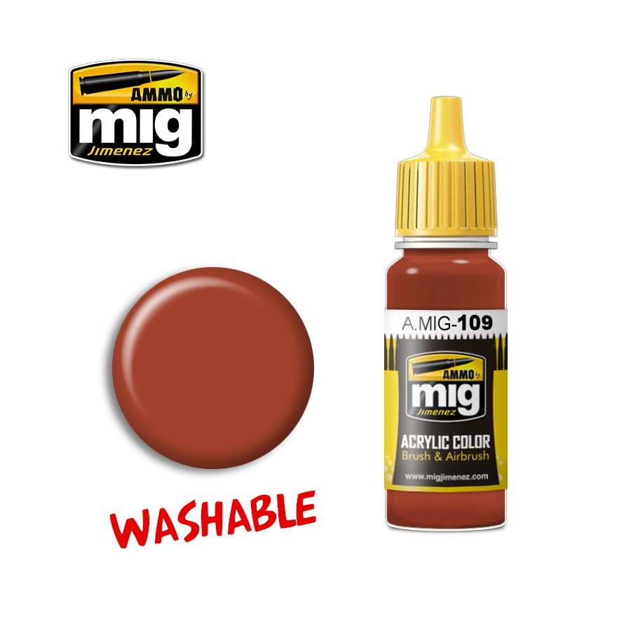 Las superficies oxidadas adquieren infinidad de colores y matices. Este producto nos permite ir retirando poco a poco la pintura con pincel y agua obteniendo de esta manera diferentes tonos de óxido. Incluso podemos llegar a retirarlo casi por completo para poder dejar a la vista otras capas de pintura u otros efectos. También podremos imitar de una manera muy sencilla los típicos chorretones de óxido arrastrado por la lluvia. Esta pintura presenta una formula optimizada para obtener el máximo rendimiento tanto con pincel como con aerógrafo. Envase de 17ml. Soluble en agua, sin olor y no tóxico. Agite bien antes de cada uso. Incluye un agitador de acero para facilitar su mezclado. Recomendamos A.MIG-2000 Acrylic Thinner para una correcta disolución.