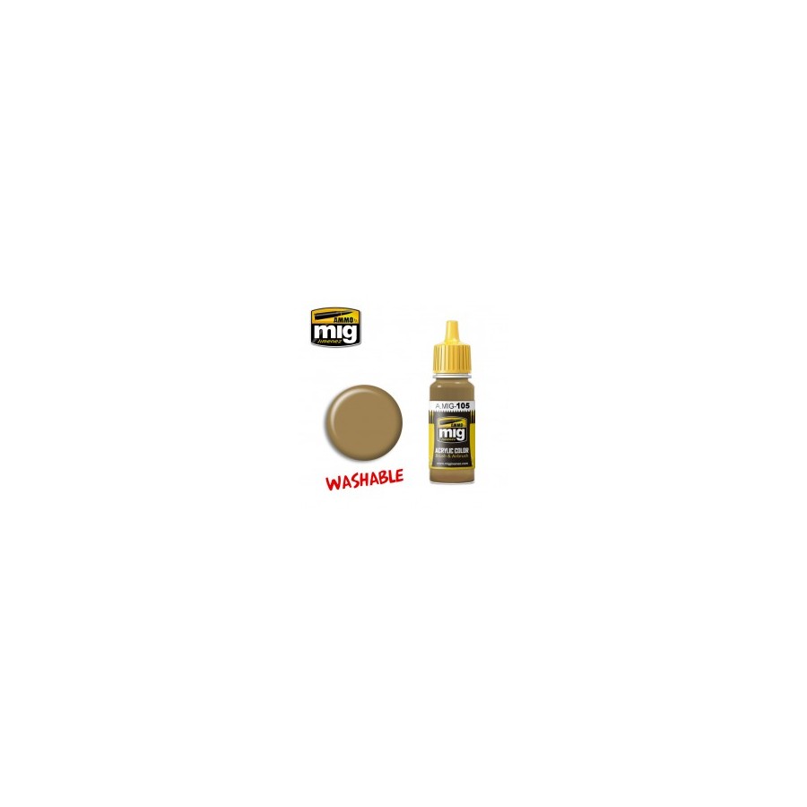 Durante la Segunda Guerra Mundial algunos ejércitos utilizaron pinturas improvisadas para camuflar los vehículos en algunos frentes, como en el Norte de África o en el Frente del Este. Estos colores se realizaban mezclando tierra del entorno con un aglutinante como aceite, gasolina u otros productos para aplicarlo sobre los vehículos. Estas pinturas solían desgastarse con mucha rapidez debido a su mala calidad y daba al vehículo un aspecto muy característico. La lluvia o el propio uso del vehículo iba erosionando y desgastando esa pintura de forma progresiva. Ese color está representado con este producto de manera exacta y produce los mismos efectos que el color real, pudiendo desgastarlo de forma progresiva con un pincel y agua para imitar los efectos de los vehículos de aquella época. Utiliza este color para camuflajes del Ejercito Alemán en África (DAK) o vehículos alemanes “Early” en centro Europa o Rusia. Esta pintura presenta una formula optimizada para obtener el máximo rendimiento tanto con pincel como con aerógrafo. Envase de 17ml. Soluble en agua, sin olor y no tóxico. Agite bien antes de cada uso. Incluye un agitador de acero para facilitar su mezclado. Recomendamos A.MIG-2000 Acrylic Thinner para una correcta disolu