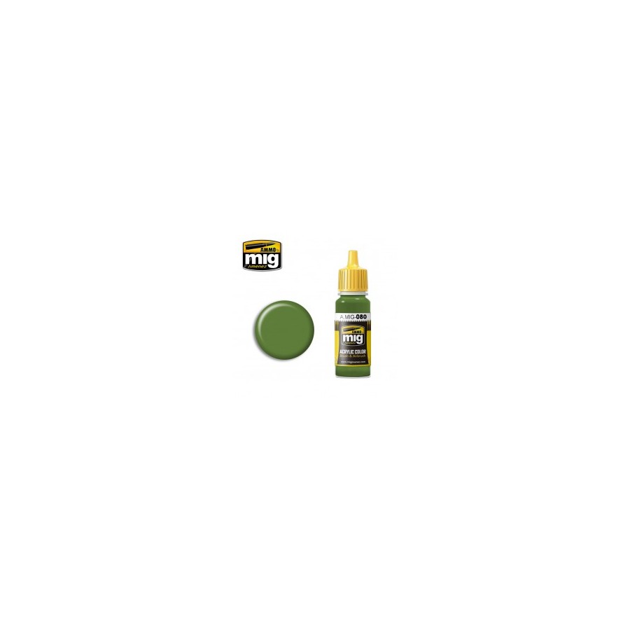 Color verde brillante. Uno de sus numerosos usos es, por ejemplo, en cajas de cambio y algunas otras piezas mecánicas de vehículos alemanes, vehículos de ciencia ficción y muchos otros. Esta pintura presenta una formula optimizada para obtener el máximo rendimiento tanto con pincel como con aerógrafo. Envase de 17ml. Soluble en agua, sin olor y no tóxico. Agite bien antes de cada uso. Incluye un agitador de acero para facilitar su mezclado. Recomendamos A.MIG-2000 Acrylic Thinner para una correcta disolución.