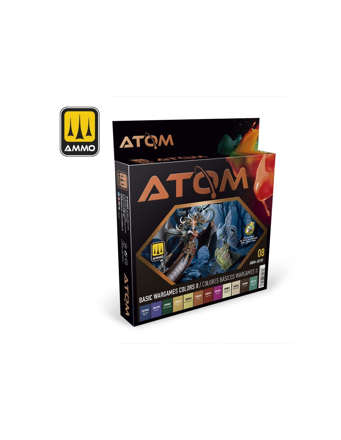 Set de 12 colores ATOM con base agua, de alta calidad y especialmente seleccionados para decorar tus miniaturas de una manera rápida y sencilla. Da rienda suelta a tu imaginación o sigue fielmente la tradición. Este set te facilita la tarea de elegir los tonos secundarios más usados en tus ejércitos o figuras, ahorrando un tiempo valioso. Los tonos son muy saturados y proporcionan unos acabados muy intensos.